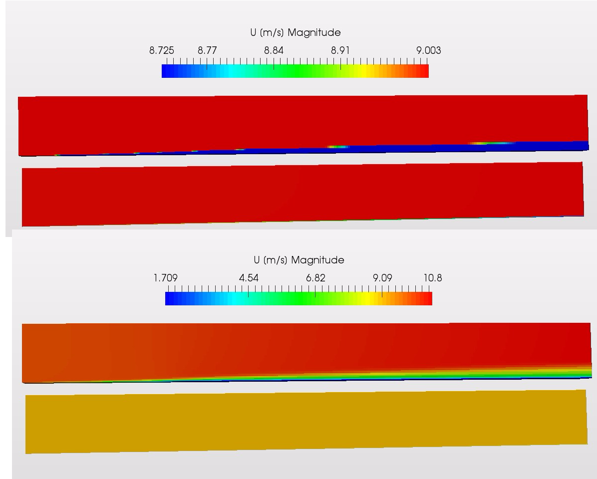 Only two runs had the roughness height smaller than this value: Run 1 and Run 7. Comparison of velocity profiles are show in attached figures (Two color scales for ease of comaprison). The results seem to match the model.