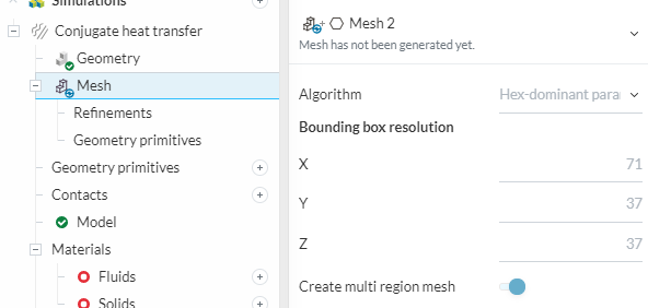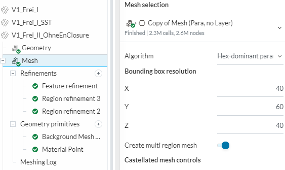 just yesterday I used the “Hex-Dominant-Parametric” Meshing type in a CHT analysis. I set the option “Multi Region Mesh” to true. In terms of this meshing mode I defined the number of cells of the background mesh and the X,Y and Z dimensions of the background Mesh Box itself. So far so good. The meshing worked well.