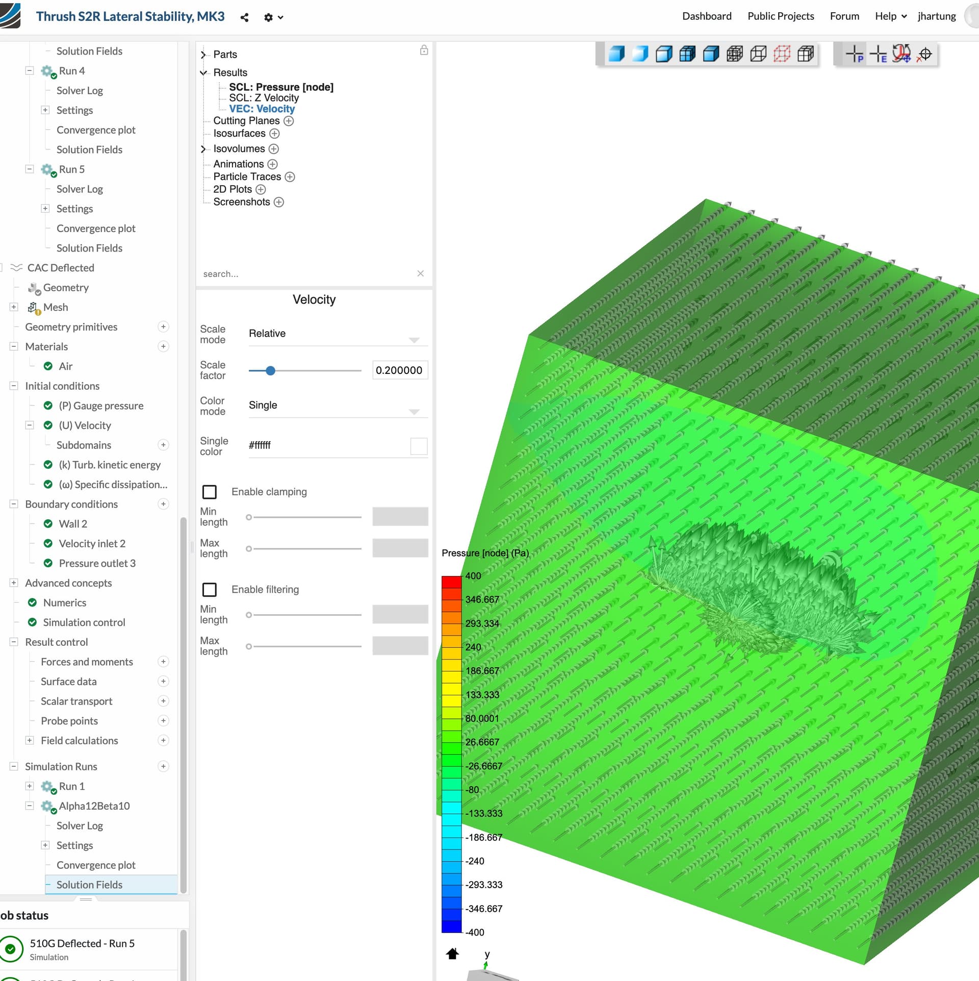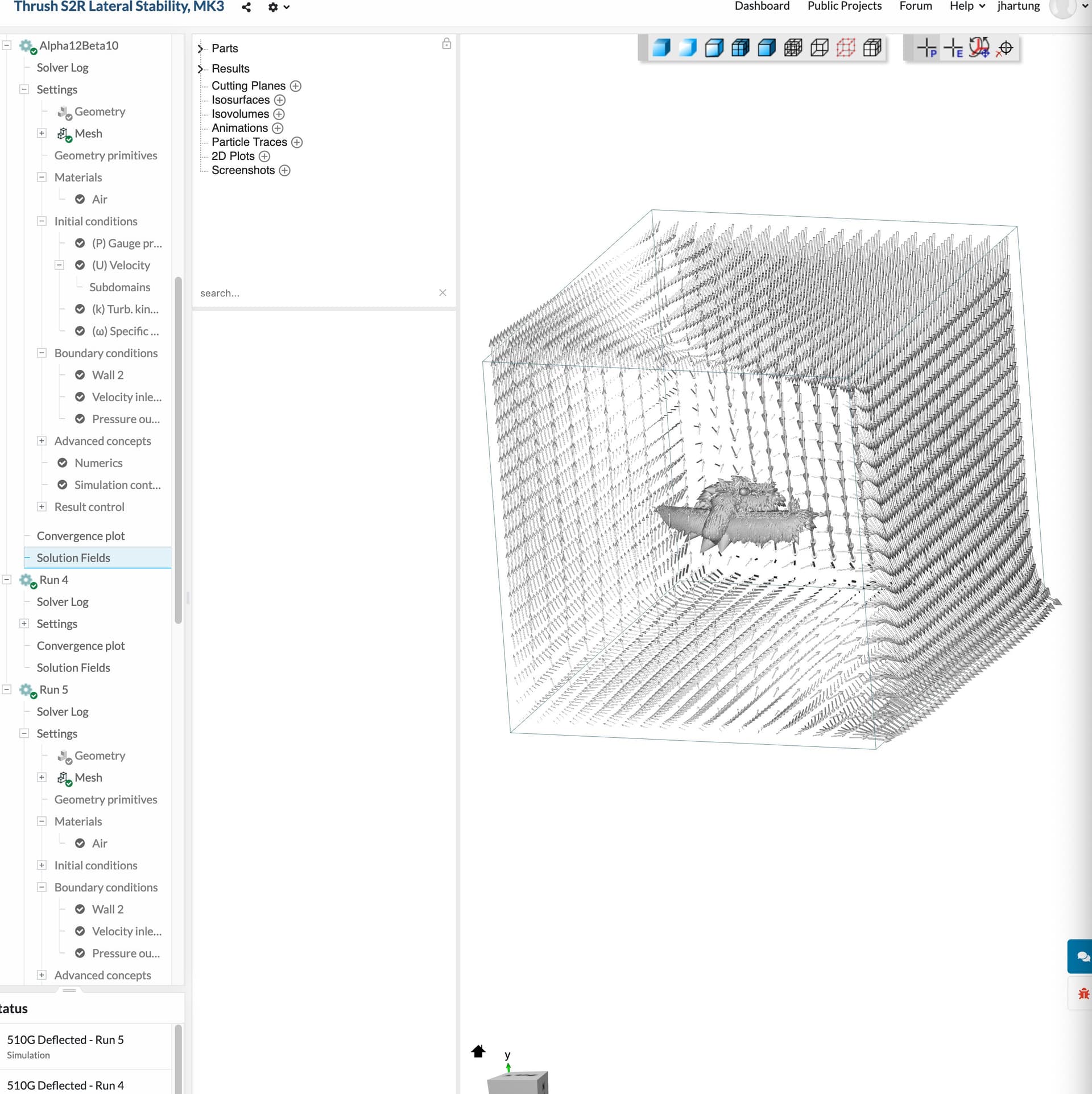 If you then go to “510G Deflected”, which was duplicated from “CAC Deflected”, you’ll find a successful Run 3. After that, I changed the velocity a bit and increased the simulation time. From then on I get results that look like the outlets forget to be outlets and the inlets pressurize the whole volume. If I run the sim shorter (run 4), this doesn’t seem to happen. When I increase the time, I get this similar behavior. If I run it long enough (Alpha12Beta10), I eventually get a failure to converge. All the runs appear to converge.