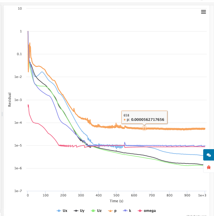 Re: convergence, I’ve been struggling to know from the convergence plot when the simulation has actually converged. Depending on the run, I’ve seen some residuals reach an absolute minimum while others continue a downward trend over time. Over the runs that I’ve performed, I haven’t been able to identify a pattern of which variables exhibit this behavior or not - it seems completely random. Example below. Would you say this plot converges ~400s or never?