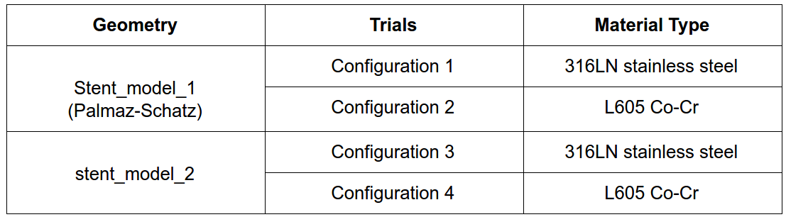 This exercise focuses on the the testing of two different types of cardiovascular stent models (shown in the figure below). The aim is to see which stent type and material is best for treatment.