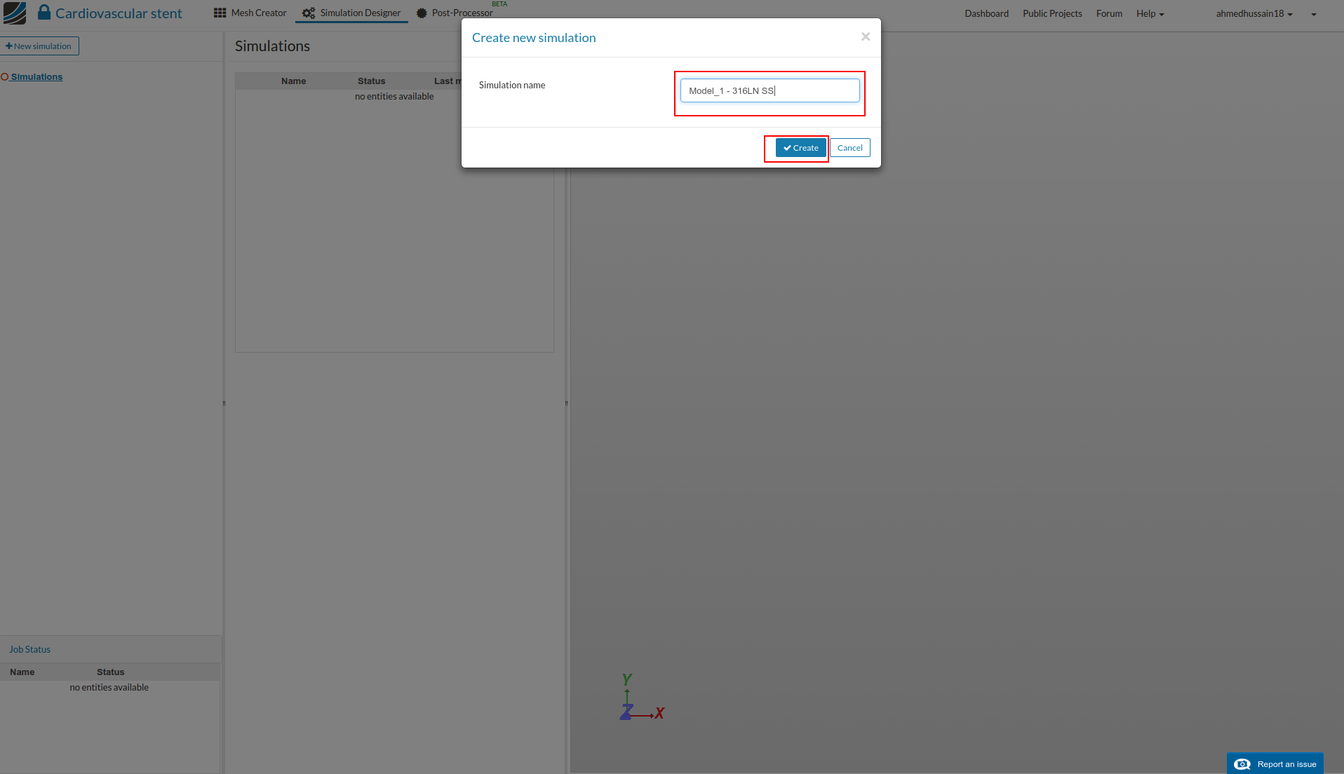 A pop-up will appear. Give the project a name (optional) e.g. Model_1 - 316LN SS in this case and click Create.