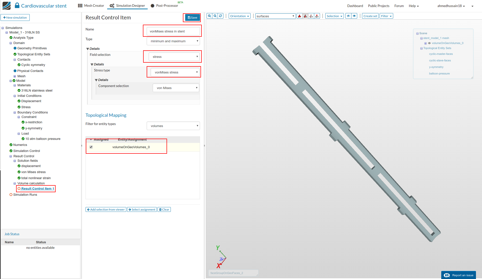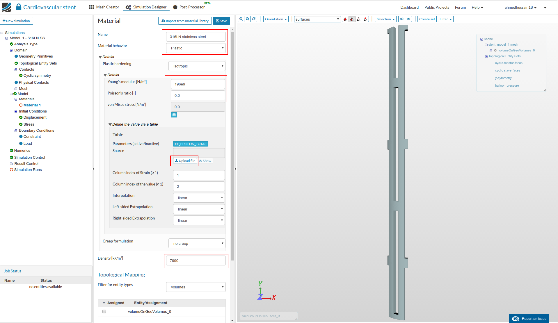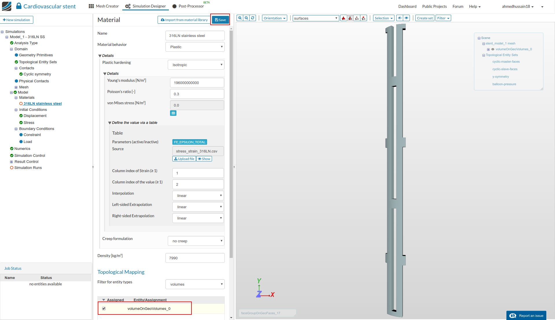 Finally, select the volume under Topological Mapping and click Save to define the material for this stent.