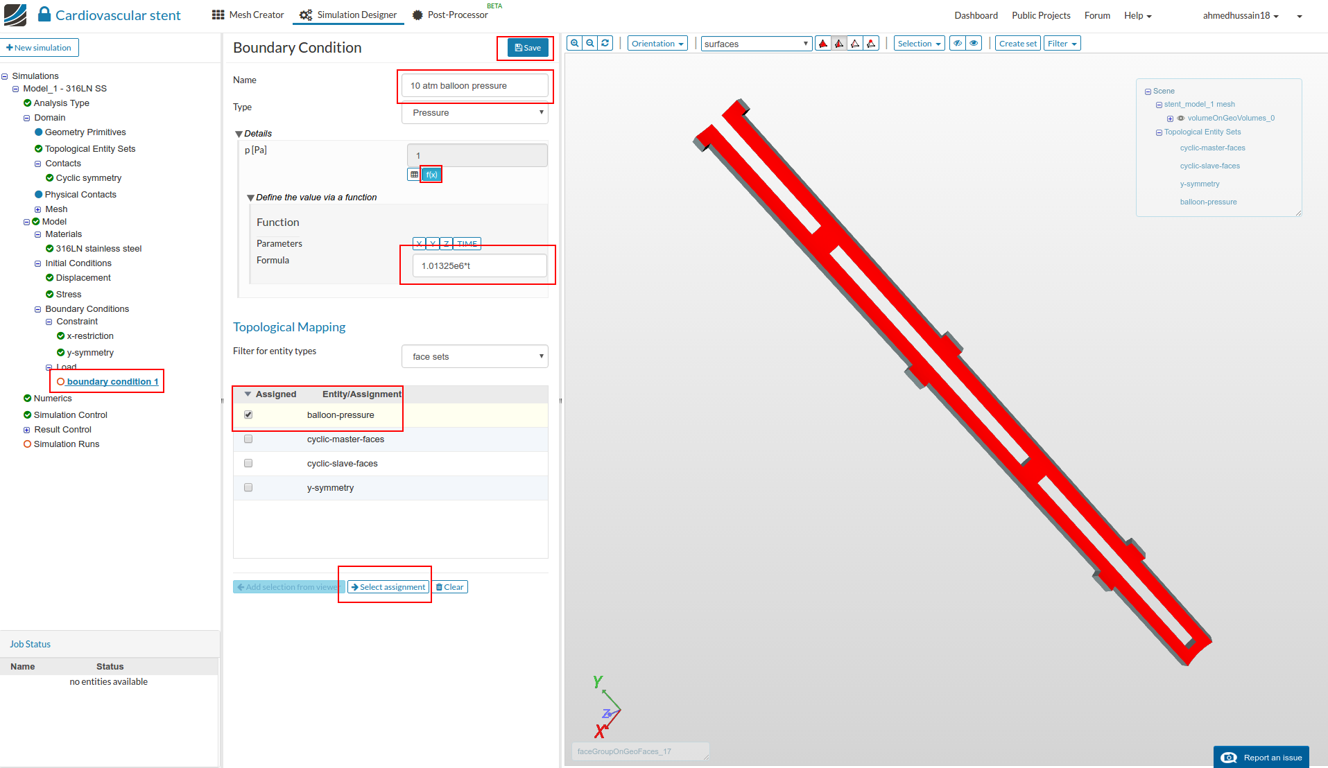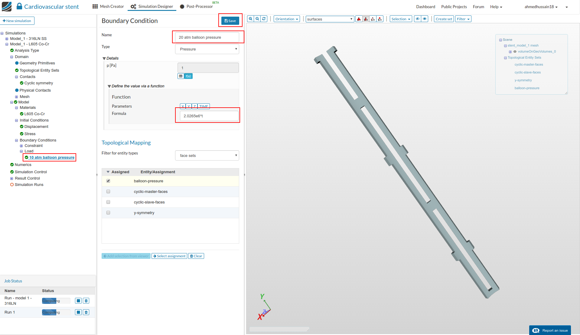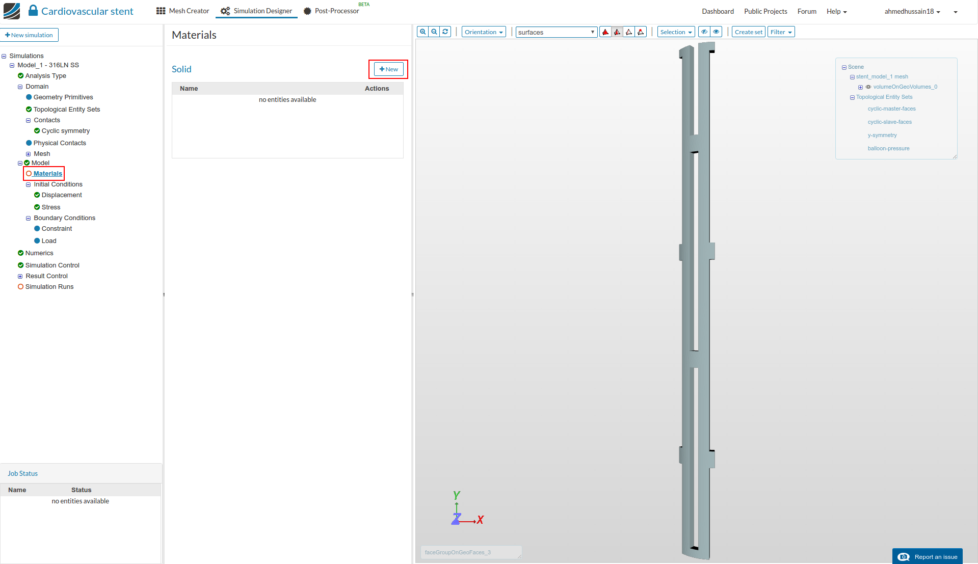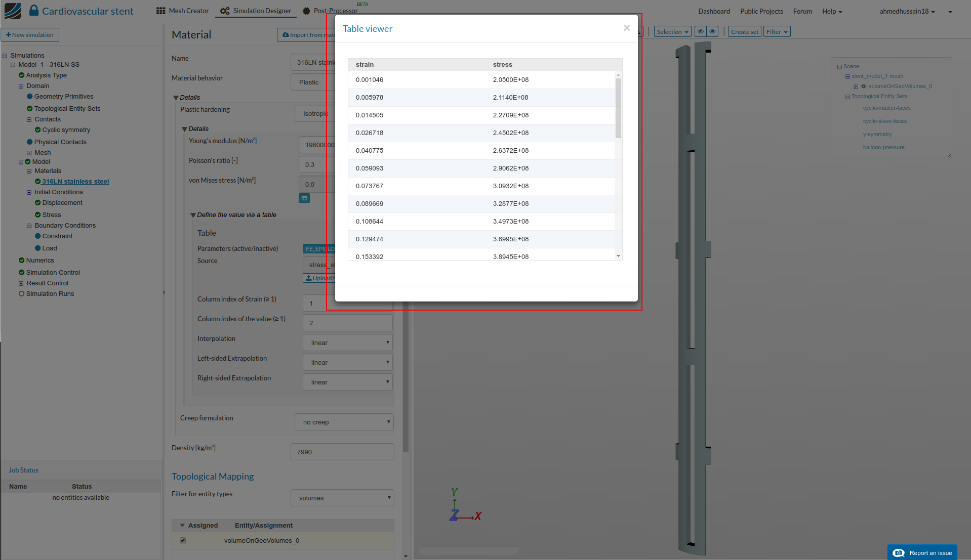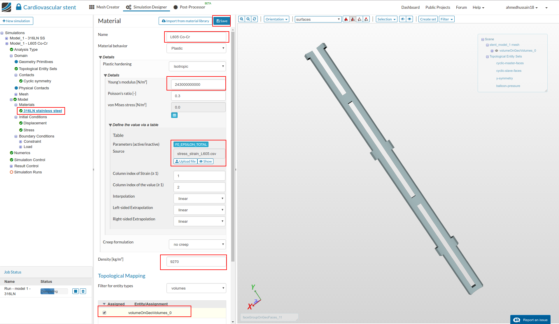 You need to first change the material definition of stent to L605 Co-Cr. Click on ‘316LN stainless steel’ under Materials, rename it to L605 Co-Cr (optional). Change the Young’s modulus, Poisson’s ratio and Density values to 243e9, 0.3, and 9270 as shown in figure below.