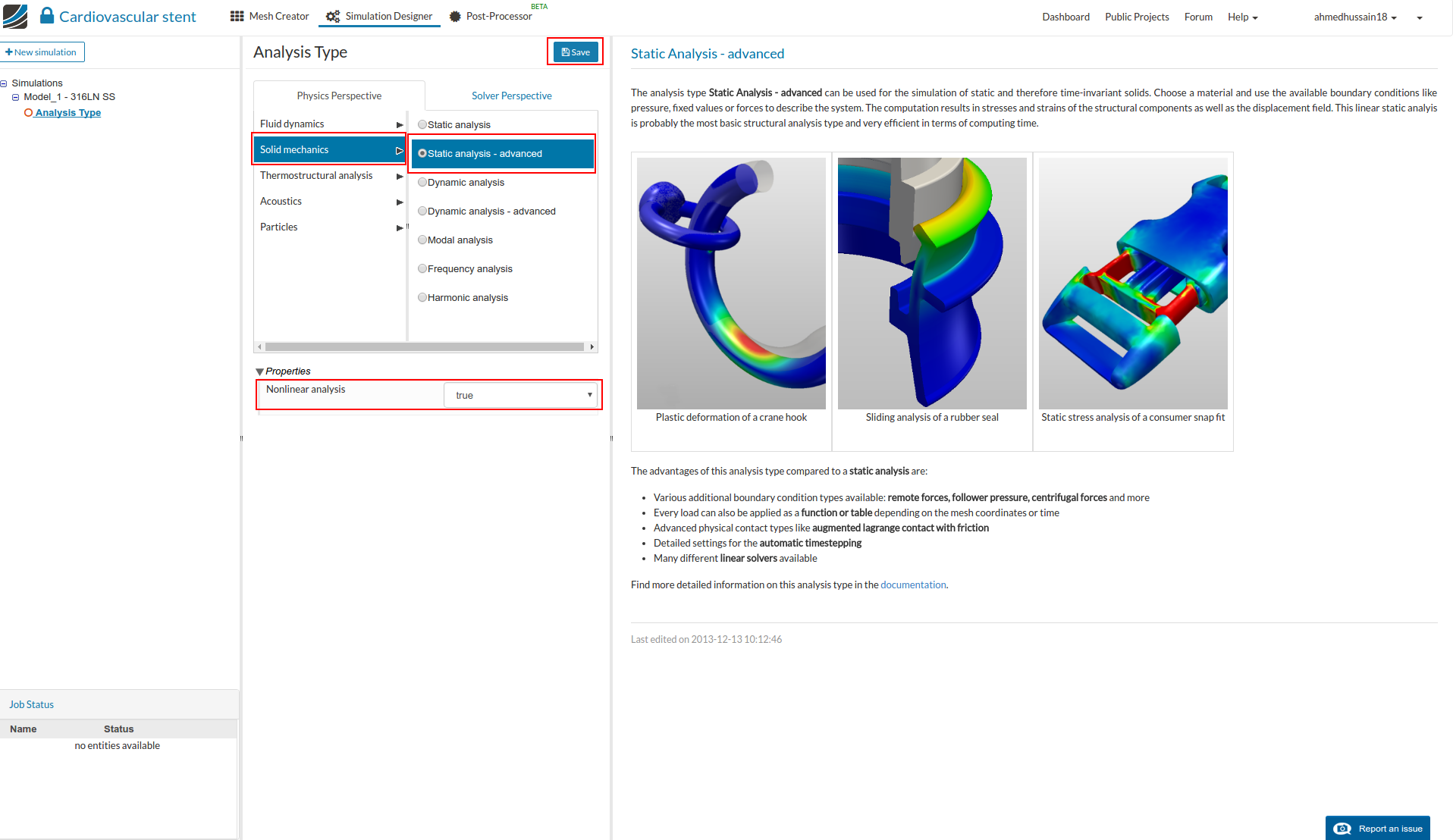 Since our load will be static and deformation will be large including material nonlinearity, select the analysis type Static analysis - advanced under Solid mechanics. Change the Nonlinear analysis setting to true and click Save.