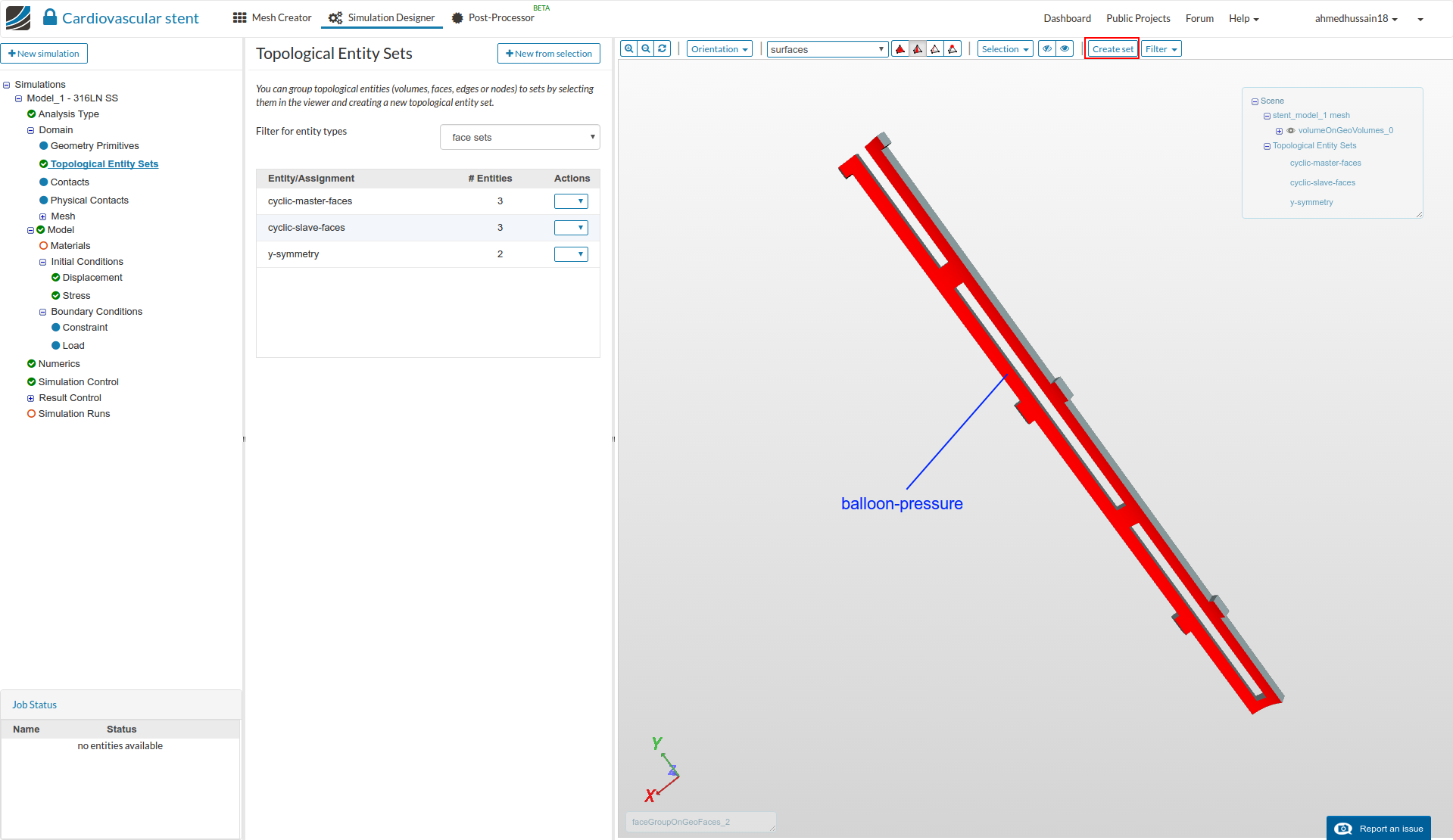 For the last set, select the inner face of the geometry as shown in the figure below. Give the set a reasonable name e.g.balloon-pressure and click Create to create the set.