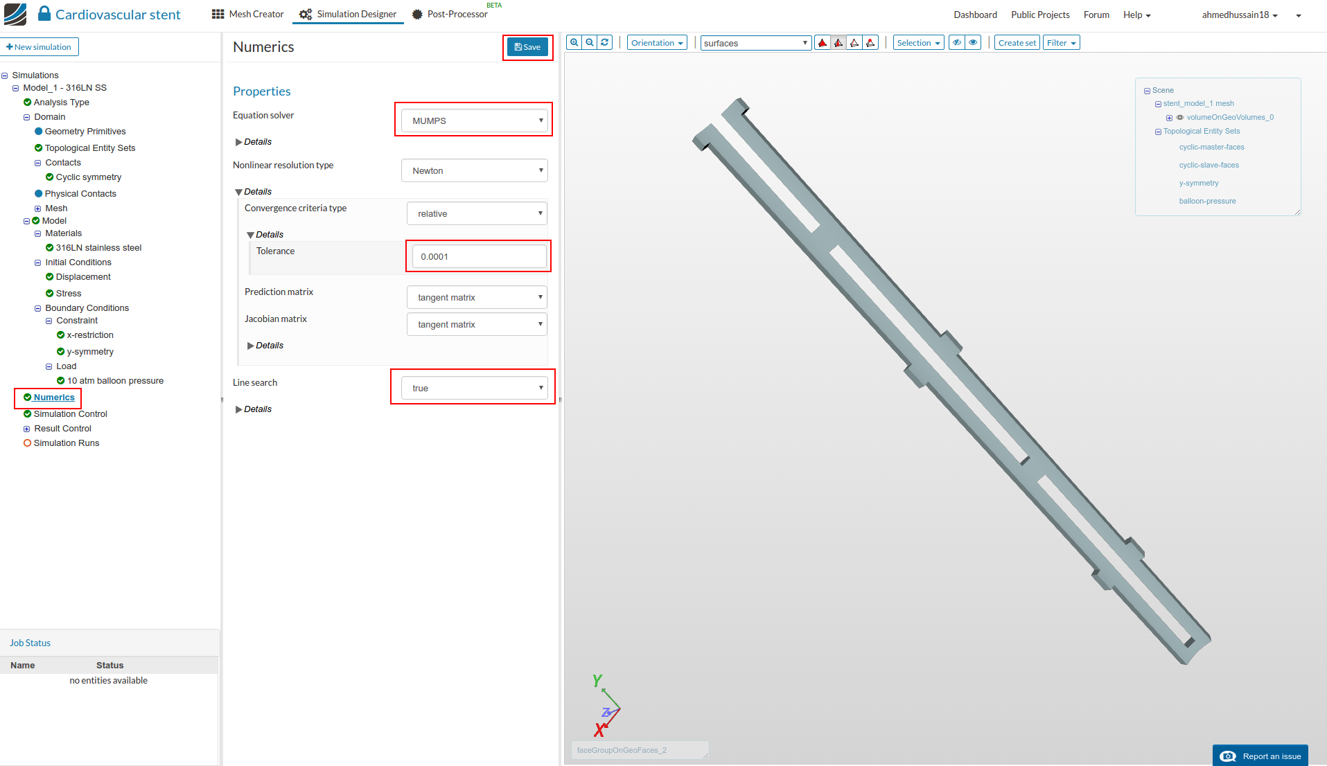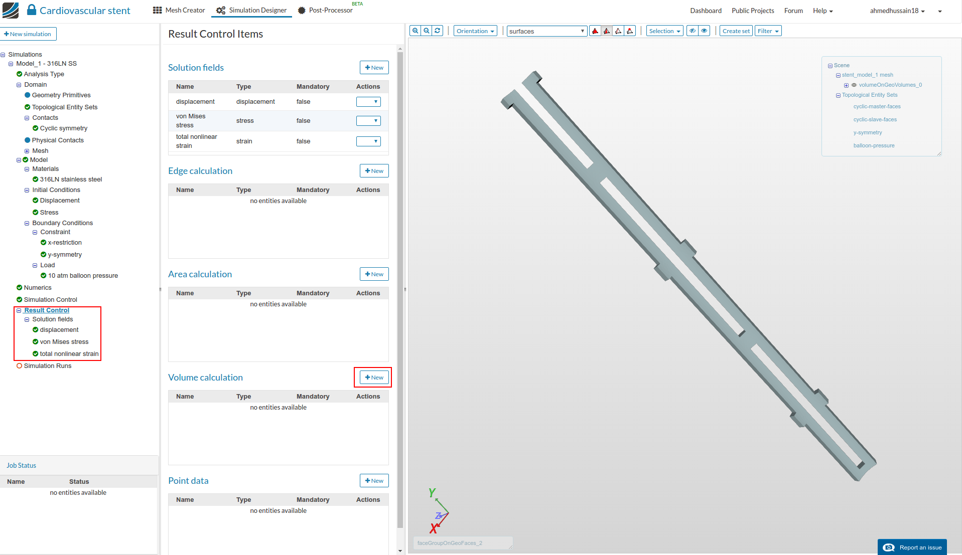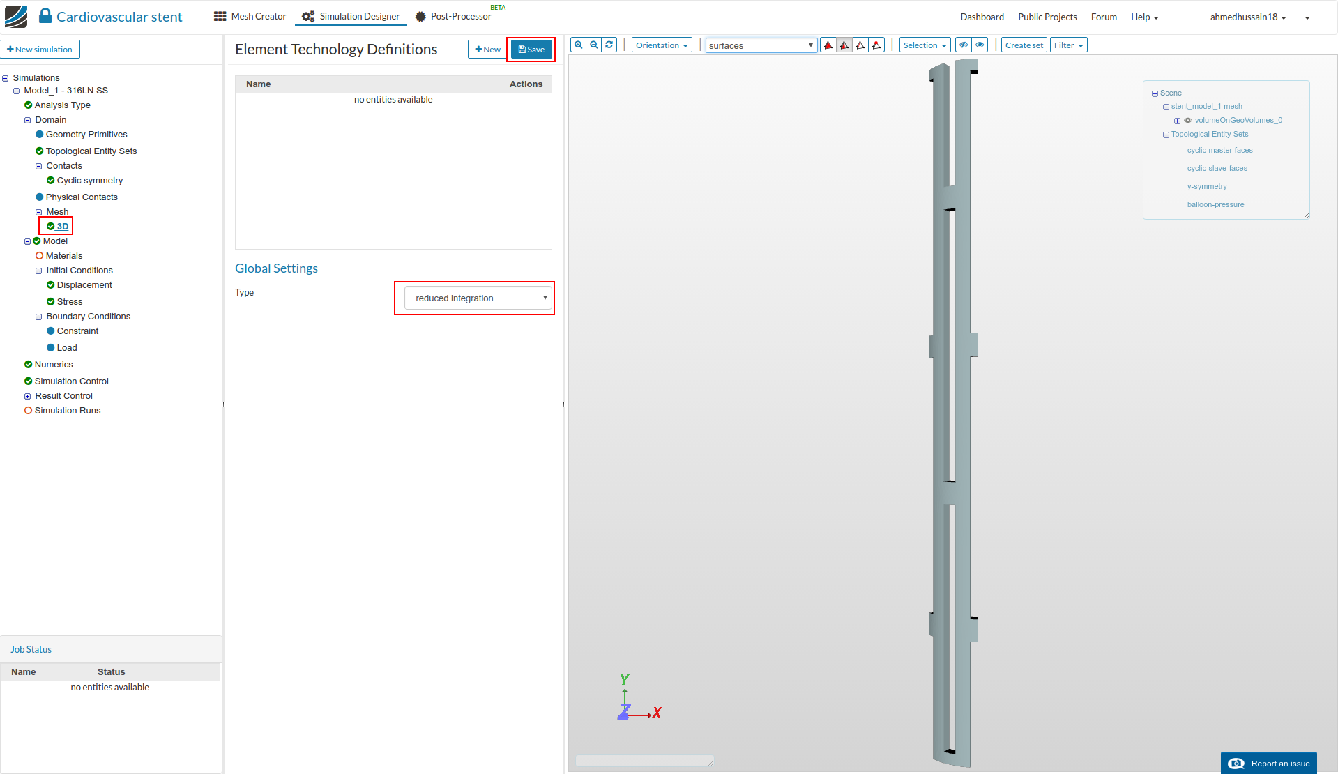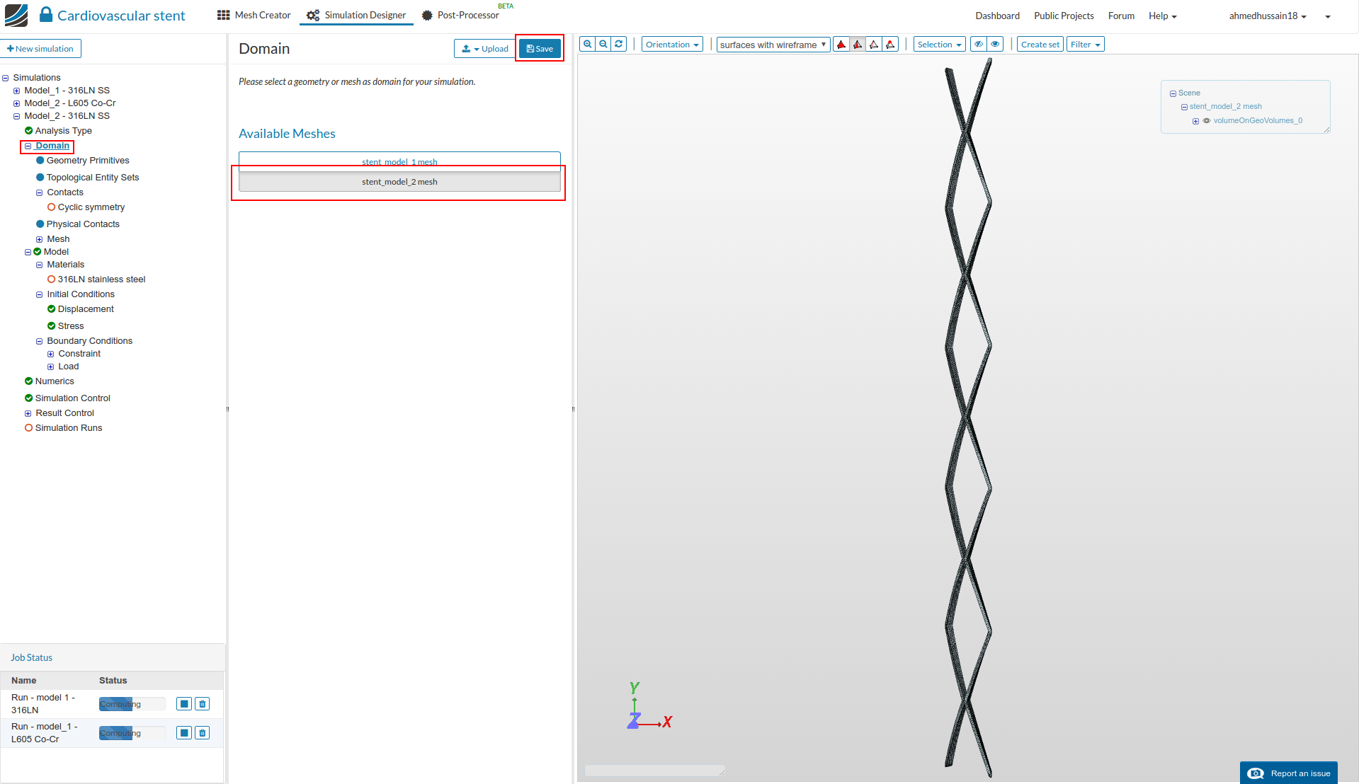 Now you have to change the Domain to stent_model_2 mesh and click Save. Click Yes on the warning message. Soon the viewer will be updated with the second mesh.