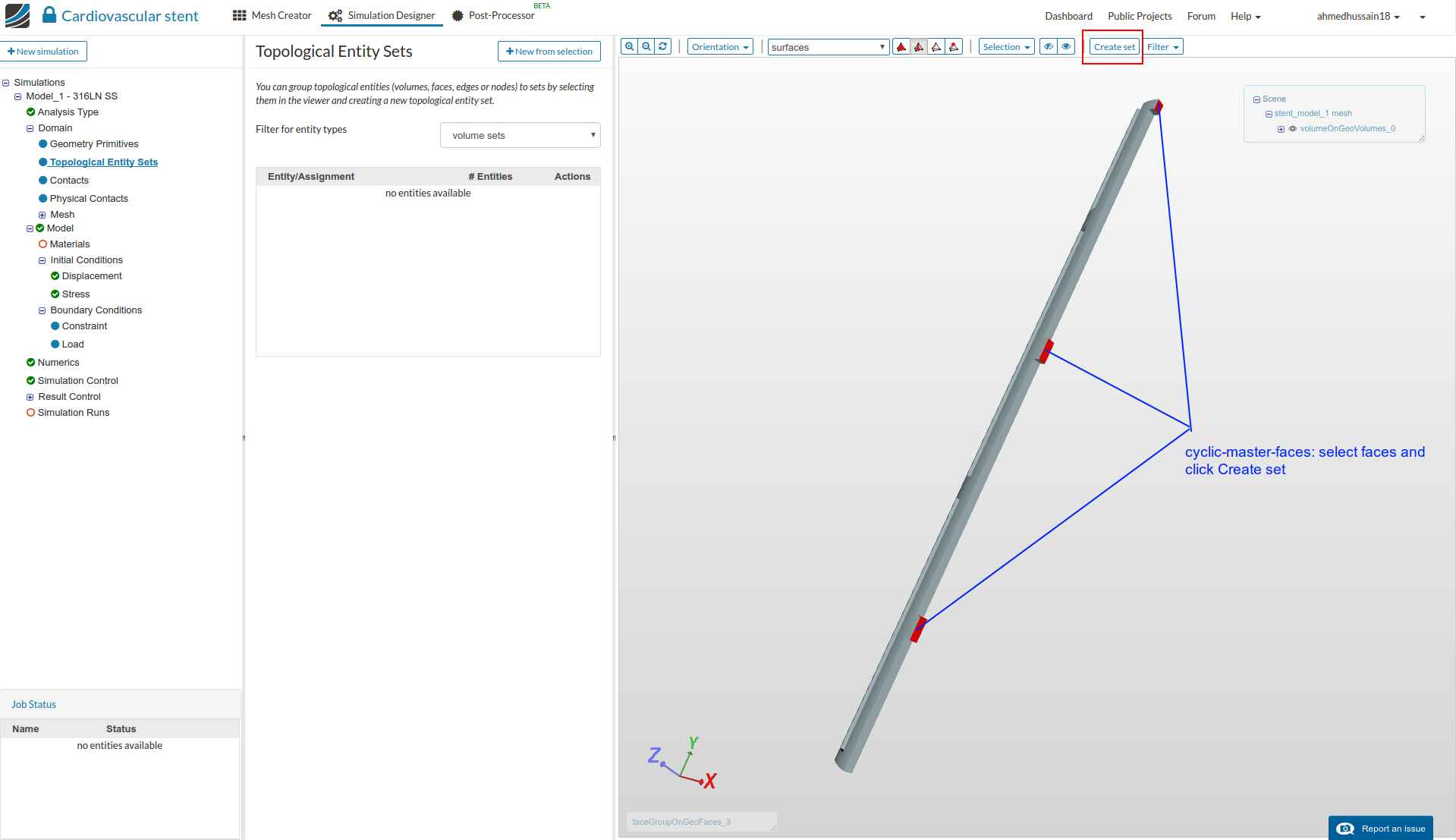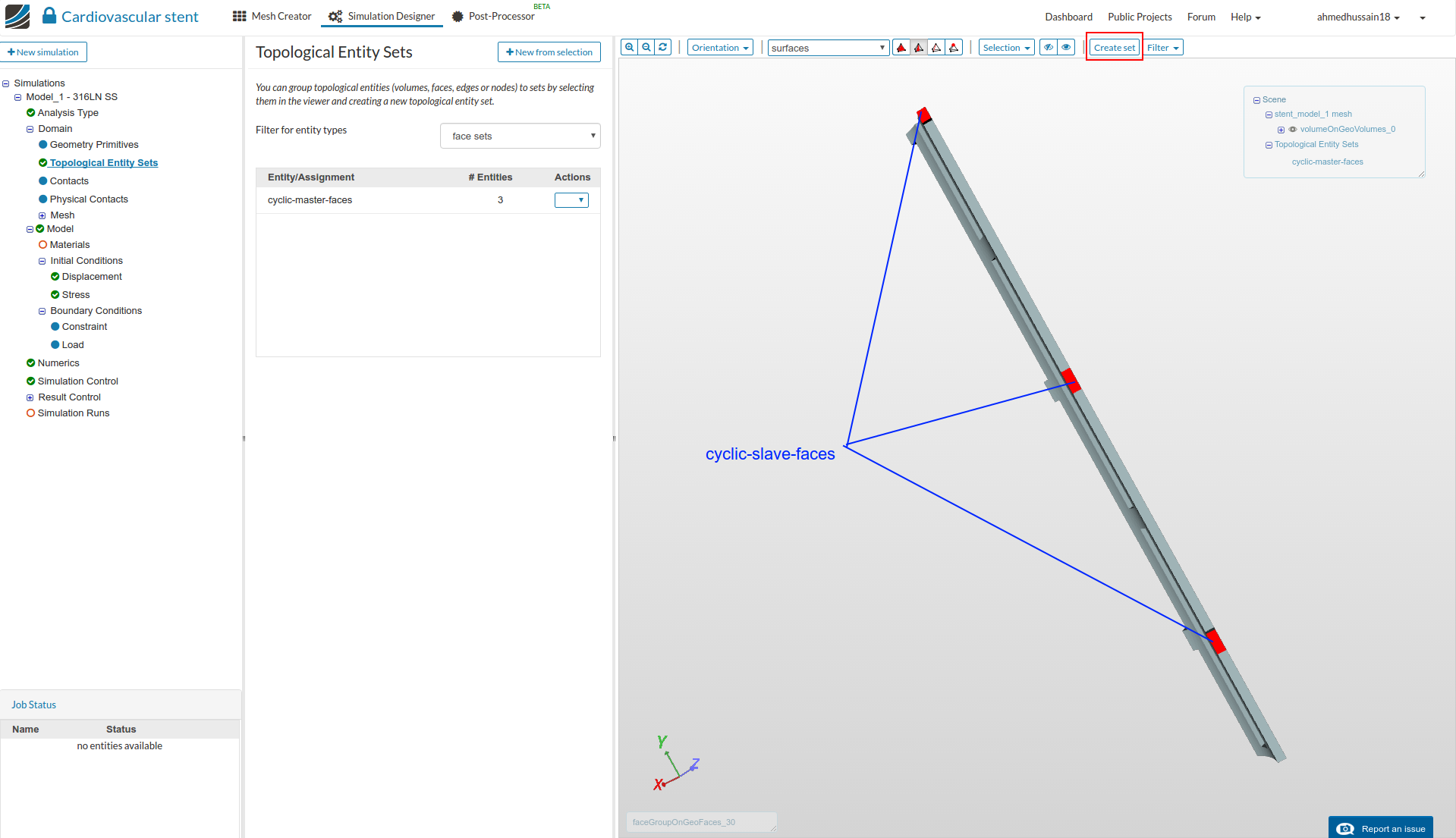 Click on the faces on the right side of the geometry as shown in the figure below and then click Create set in the top viewer bar. Give the set a reasonable name e.g. cyclic-master-faces and click Create to create the set.