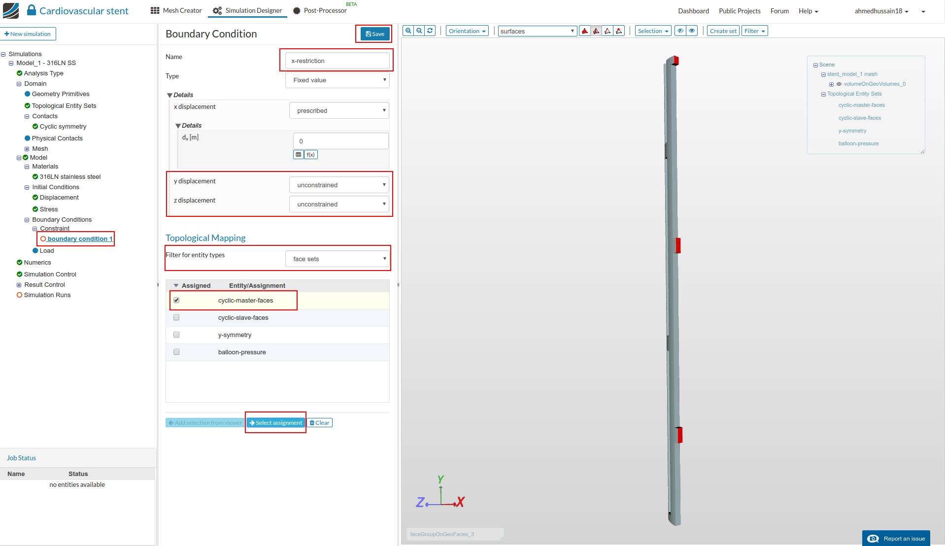 Change Filter for entity types to Face sets under Topological Mapping and select y-symmetry, click Select assignment to see highlight the selected assignment in the viewer. Click Save to save the constraint.