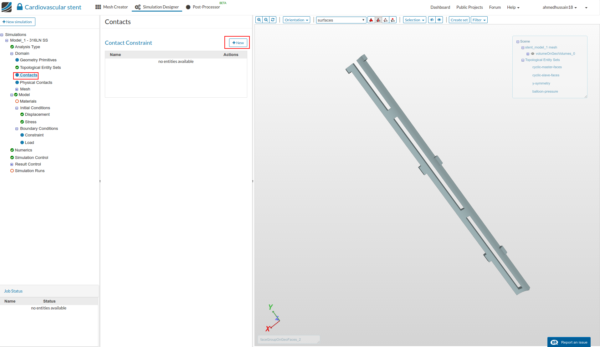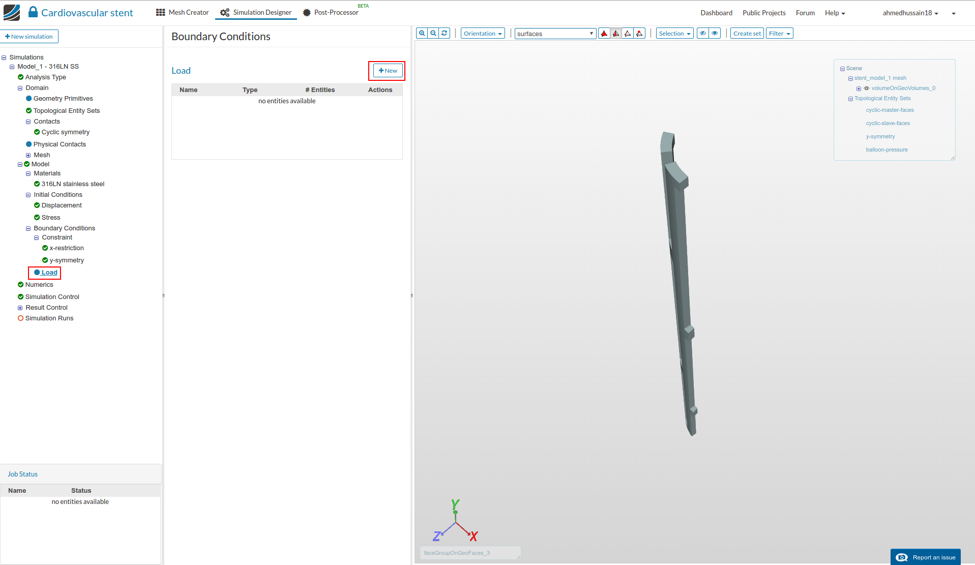 Next we will define our load boundary condition of the balloon pressure on the internal surface of the stent. Proceed to the Loads item in the Navigator and click +New to create a new load definition.