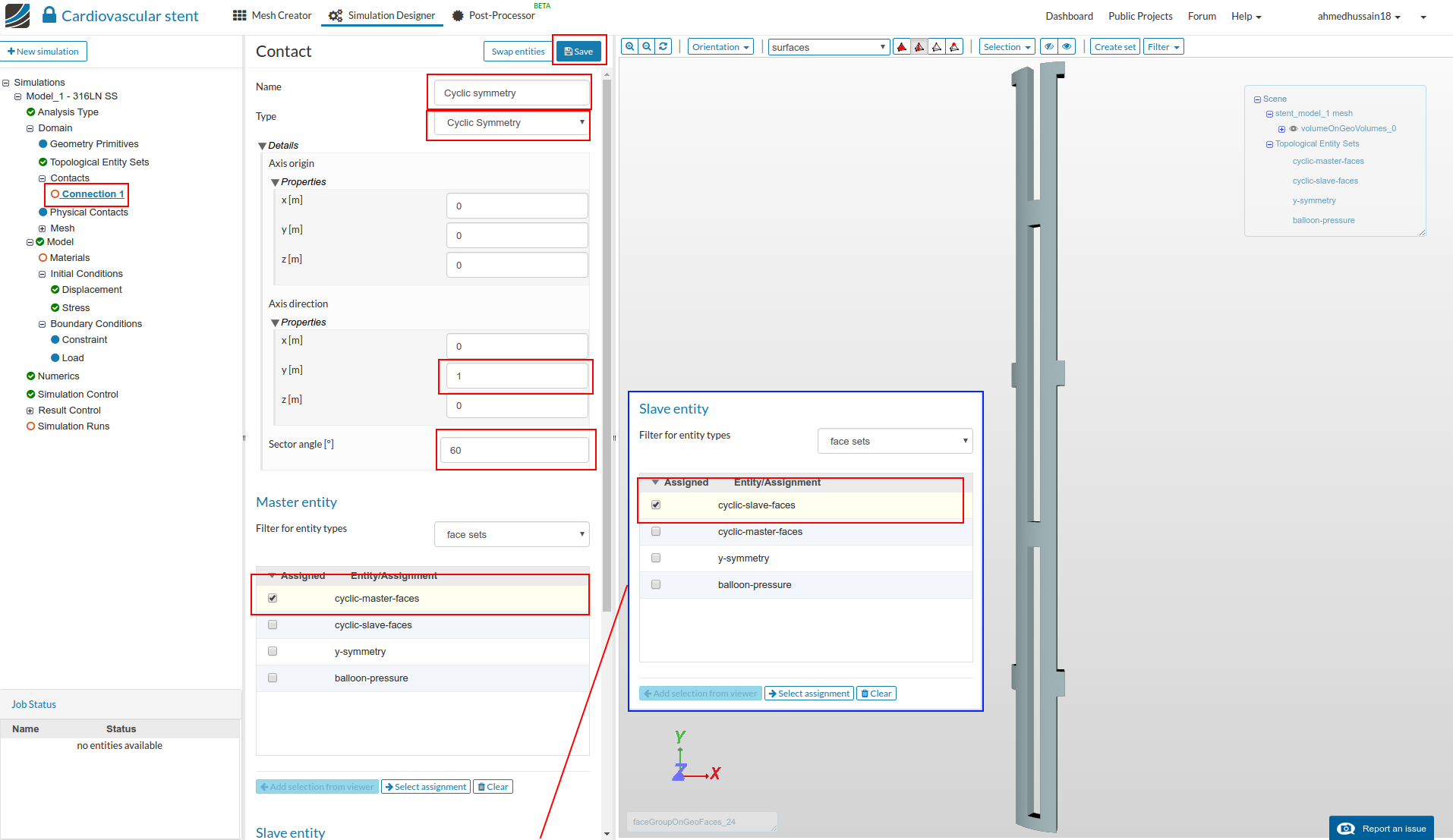 Next select cyclic-master-faces under the Master Entity and cyclic-slave-faces under the Slave Entity respectively. Click Save to define the cyclic symmetry.