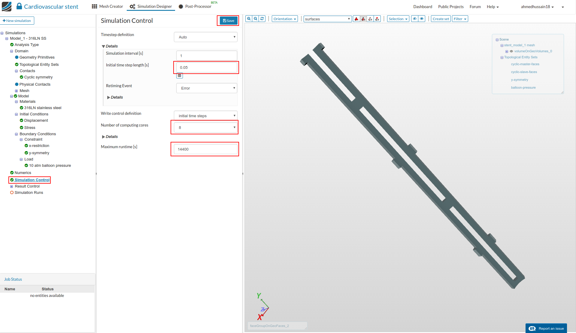 Click on Simulation control and change the Initial time step length [s] to 0.05, Number of computing cores to 8 and Maximum runtime [s] to 14400.