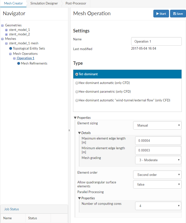Click on Save and then Start to start the meshing job. The meshing job will take a few minutes to finish and show the status as Finished once done.