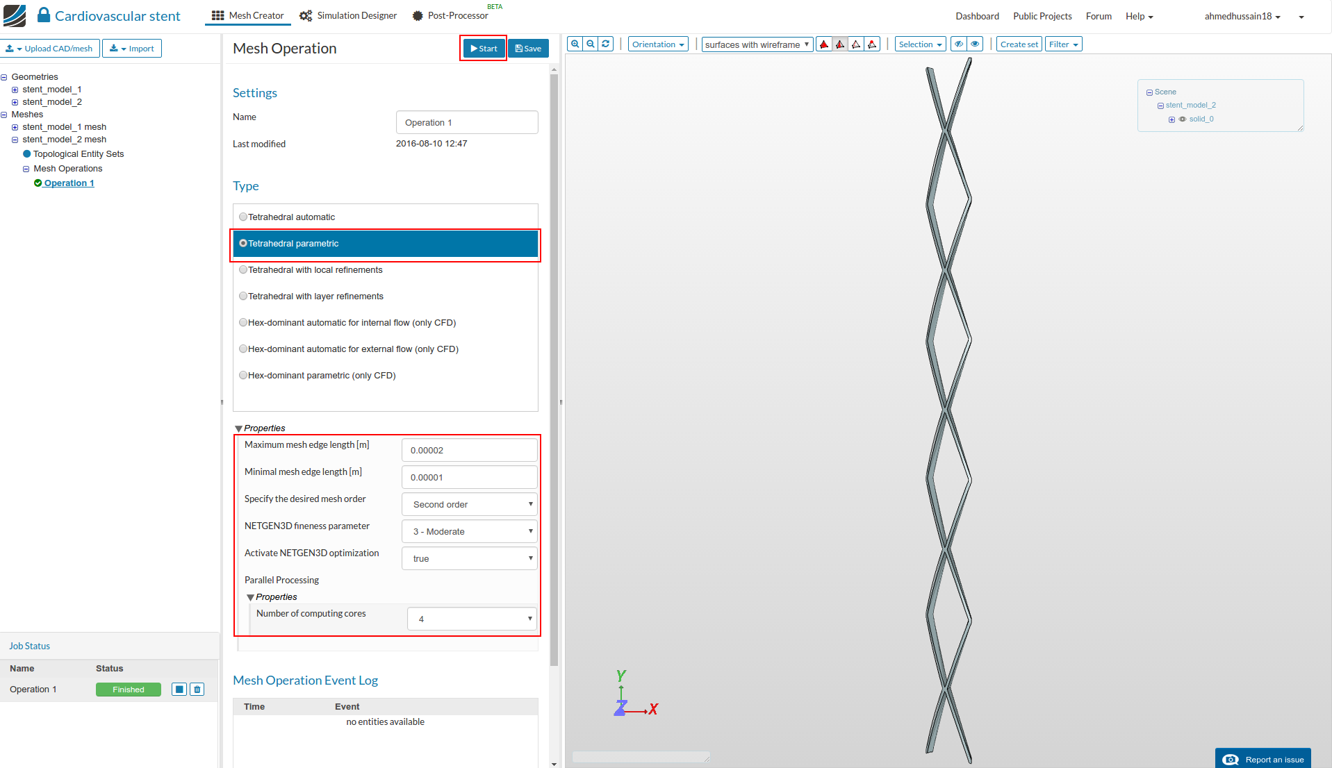 In the Mesh Creator tab, click on the geometry stent_model_1