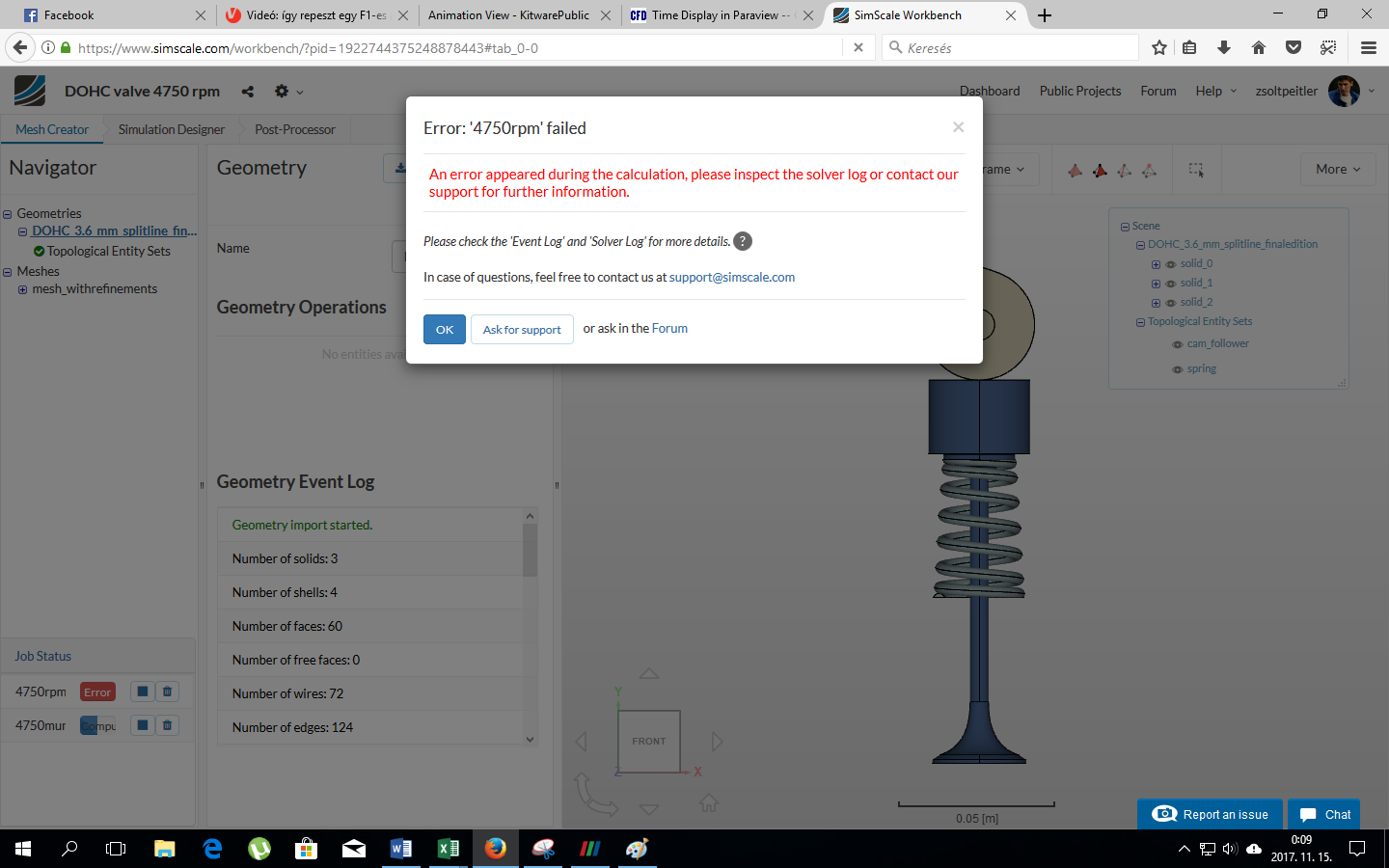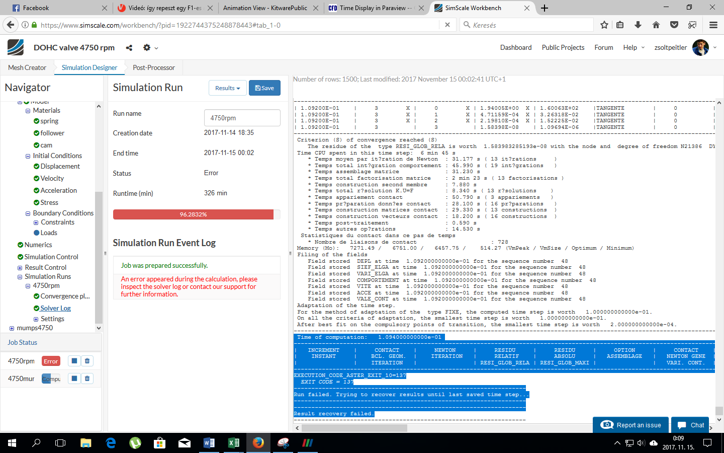 And final i would like to make a simulation where the camshaft is rotating 4750RPM with the same numerics and simulation setup as the other finished simulations but I don’t know why it is always run to error. It is not show anything, just error. I tried it with PETSC and MUMPS equation solver, but the result was same.
