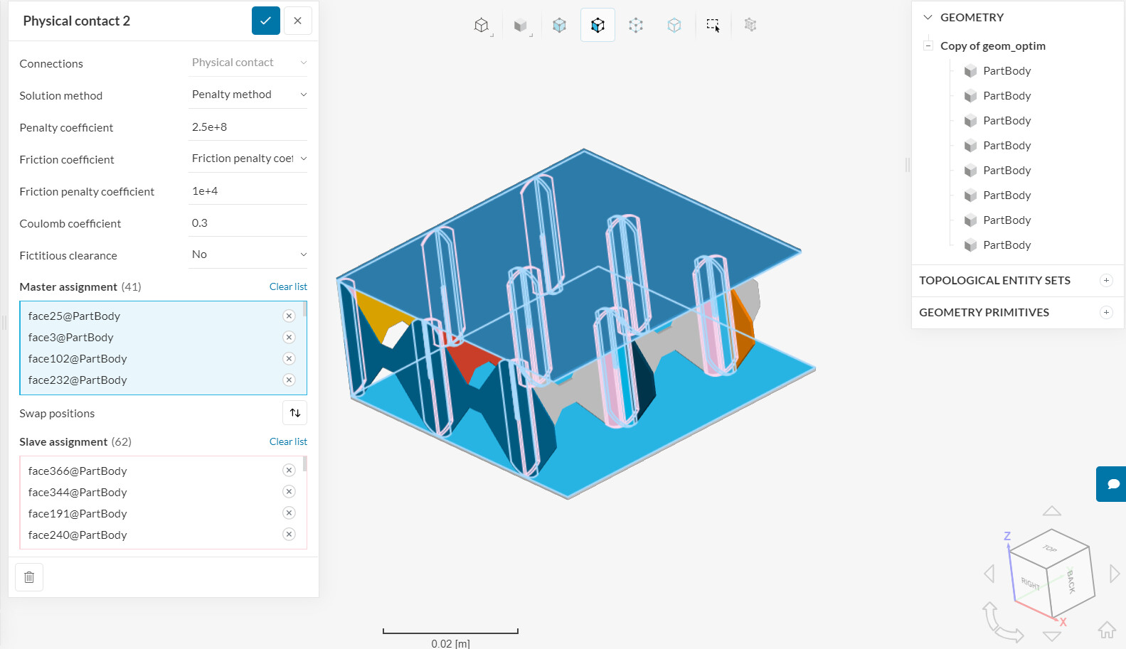 Run 35 36 37 have finished. Only 36 converged without error. Run 36 had the horizontal faces with fixed values ( x and y constrained to 0 and z free). The results give reaction at the supports and are too low ( of order 10^-3 compared to experimental data). Is the penalty coefficient the parameter to be changed to get higher values of reaction ( while keeping the material data same), or mesh refinement at the contact points? Would these help?