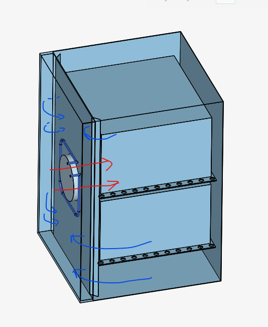 As you can see in the picture id like there to be a velocity inlet into the cabinet (basically an oven) at a speed of 0.975m/s (red arrows) and a pressure outlet past the flaps on the back panel (blue arrow). The fan region will be a rotating zone at rpm 220. Element is a 500W power source. Any idea how I can define the boundaries without there being an error - Multiple boundary conditions or interface assignments for the following entities: face1821@air, face1804@air, face1778@air
