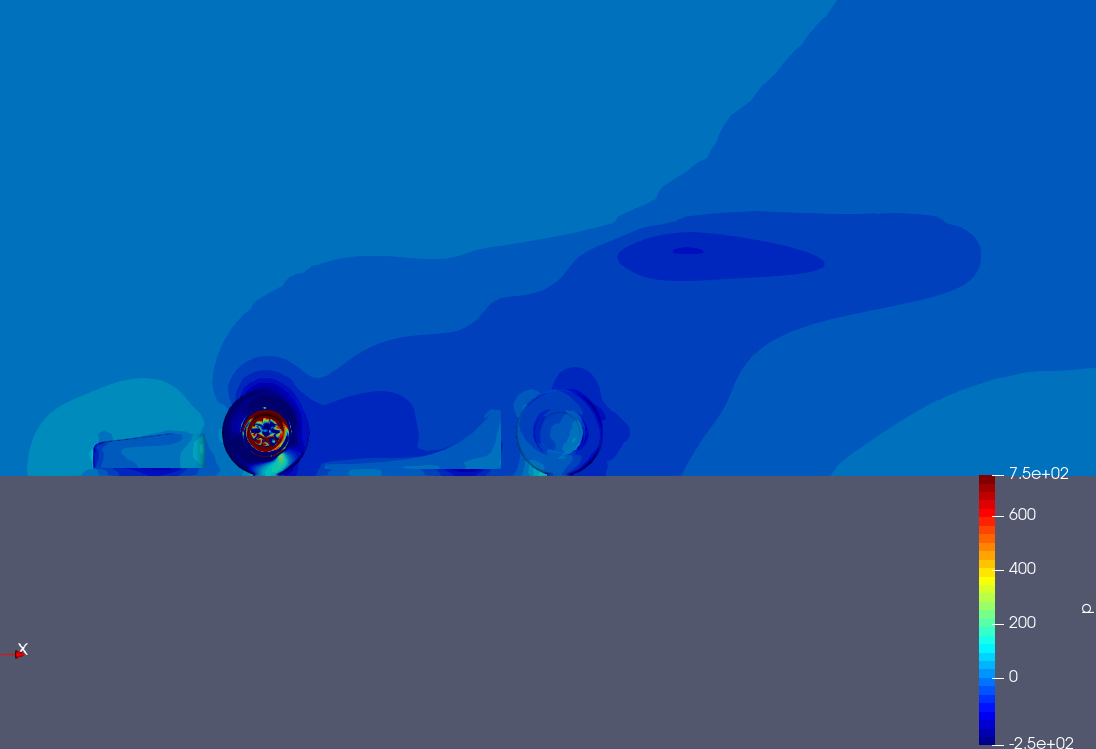 In the simulation with the reduced inflate boundary layers, the lift/drag values were drastically different on every probe. Wheels, body, FWing, RWing, etc. Nothing was consistent between the results. Yet the only thing that changed between the two simulations was that boundary layer reduction. We’re also not sure about the rotation of the wheels in our setup. According to the right hand rule, with the y-axis point to the center of the car, the rotation axis should be -1 in the y, but in our post results, the tire squish seems to be behind the tire not in front.
