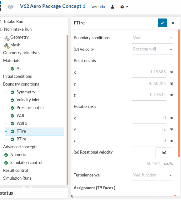 We’ve set up a new simulation with the angular velocity set to 68.444 instead of -68.444, and are monitoring the force outputs. So far, they are following the same trend in forces as the simulations that we have run on this concept before with reversed angular velocities. I checked to see if our MRF assignments for the wheel centers were correct, and they have the same settings for rotation as the wheels themselves.