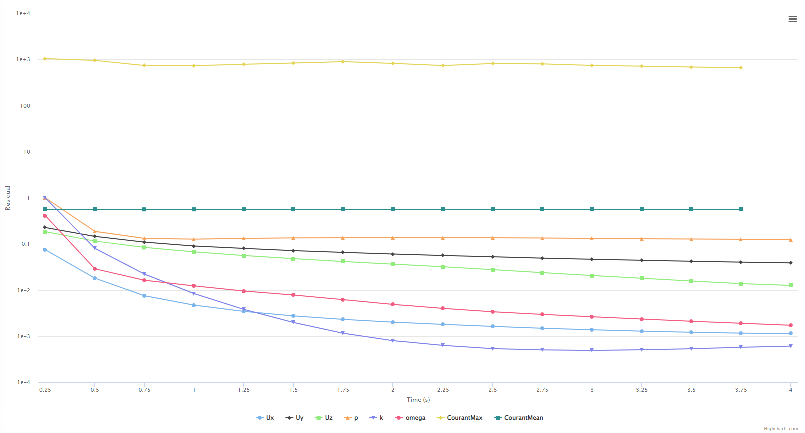 The second issue i am having is with the convergence of my data, I partially believe this may be due to needing the simulation to run for more iterations (which i have now changed). I am unsure on what values need to lie below the 1e-3 values suggested in the documentation. With regards to the Courant number i have made the simulation apply the max Courant of 0.7, which was not done before.