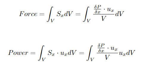 To calculate power, I have done a unit analysis and applied basic laws to derive the following equations. Where S_x represents a source term, and dP/dx represents the gradient of momentum given by the result file. u_x is the normal velocity through the momentum source.