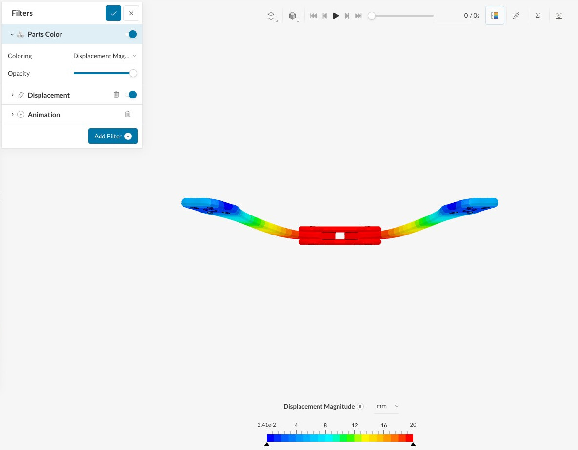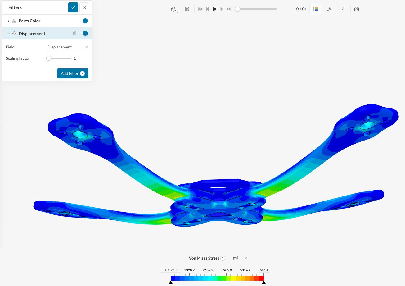 With these boundary conditions the Von Mises stress is 6,600psi which is about at the limit that you would want it. The deflection of the arms is 20mm, this could be more than you would want for a drone.