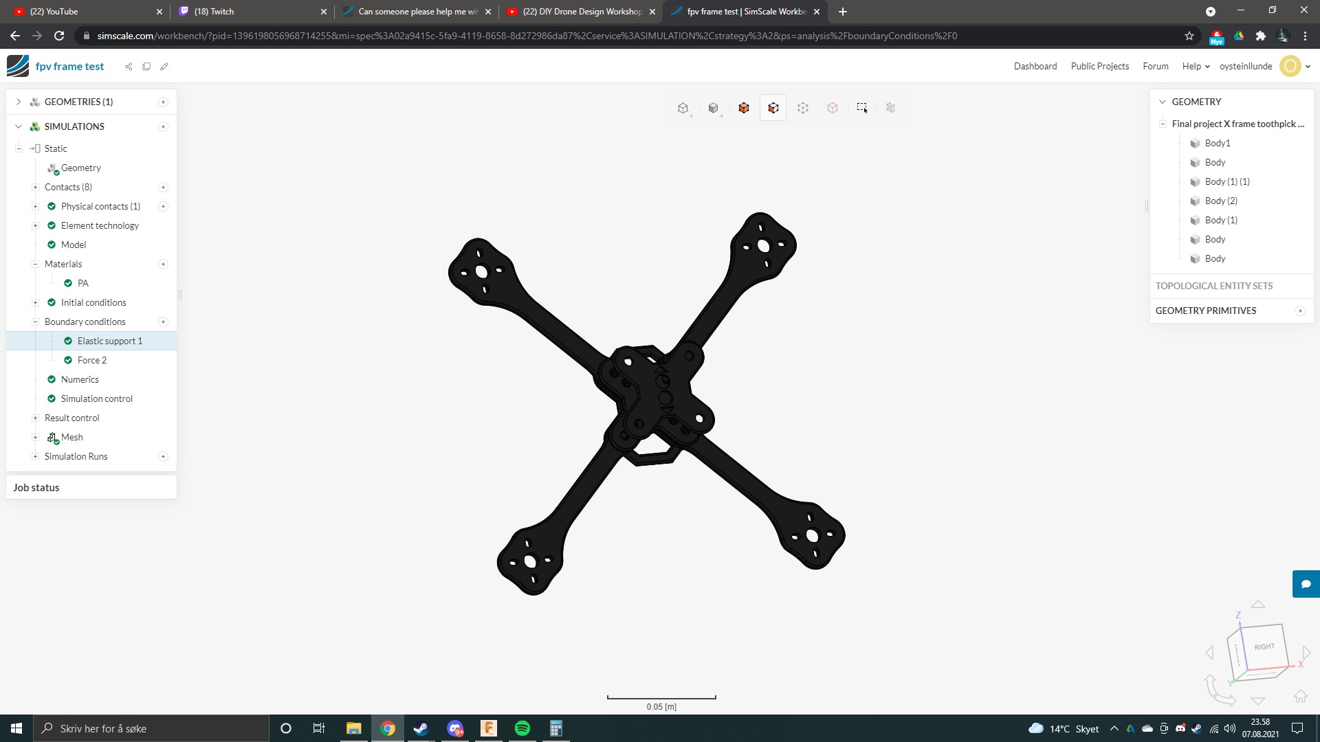 I took a quick look at your public project, fpv frame test, and it looks like you were able to get your simulation to run but I think you still have a few issues.