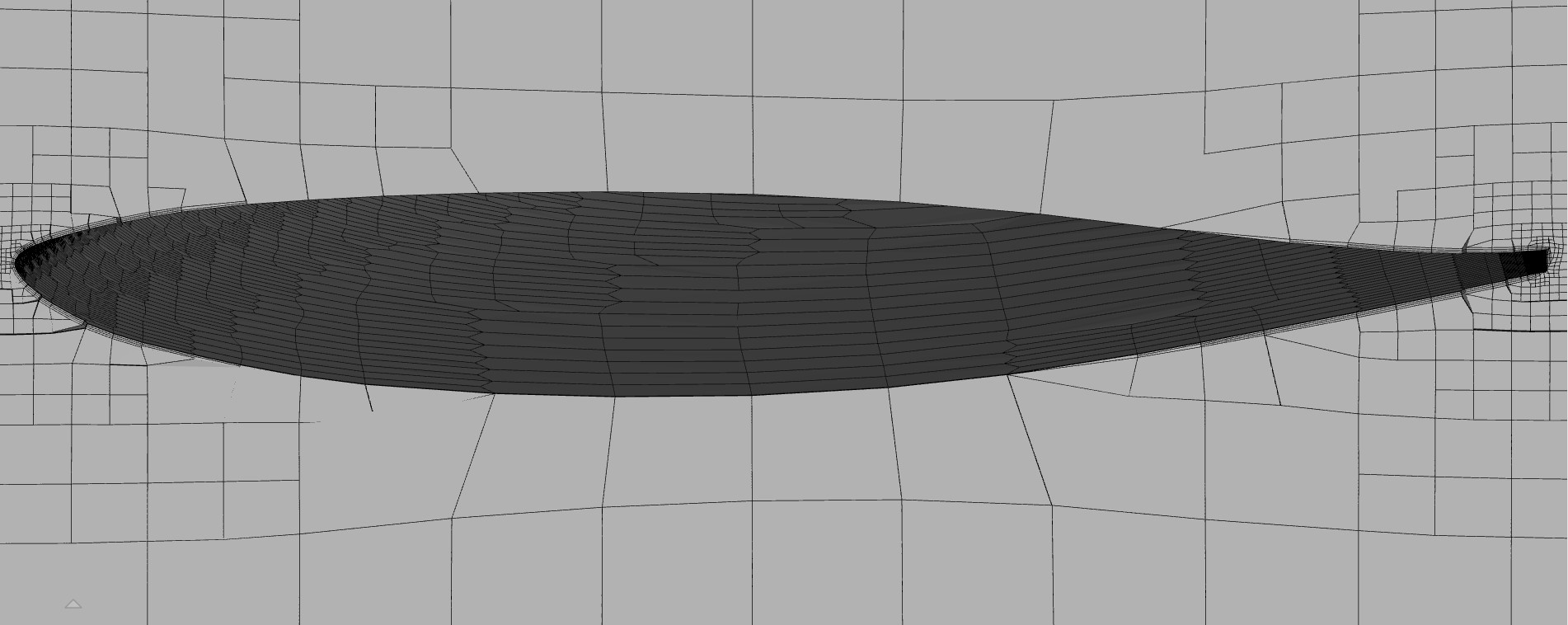 Mesh 4 : ABS Layered mesh with 4 layers, 2.5m reference length and a sum of layers thickness of 0.0207 inches. The large cells on upper and lower surface were refined at Level 4