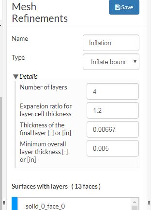 Mesh 2 : ABS (not relative) layered mesh with 3 layer, 0.3m reference length and a sum of layers thickness of 0.105 inches