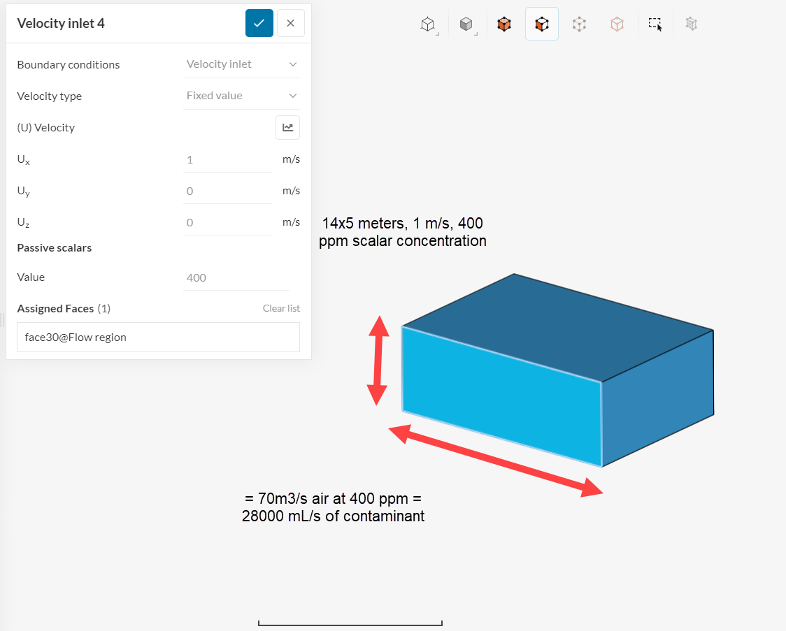 So I understand from your discussion above that currently 28,000 mL/s of CO2 enter at the inlet velocity. Is the current boundary condition at the inlet set up correctly to signify 400ppm? Or should I specify that 28,000mL/s enter at the velocity inlet as follows?