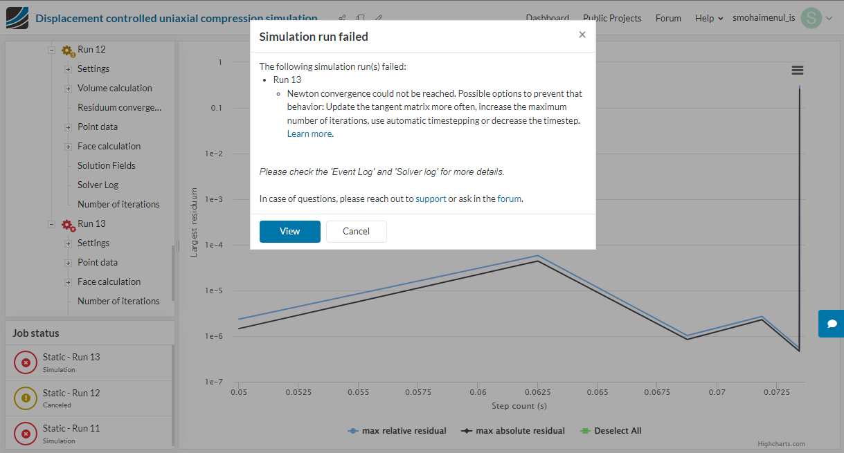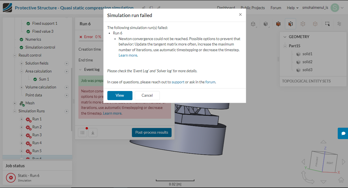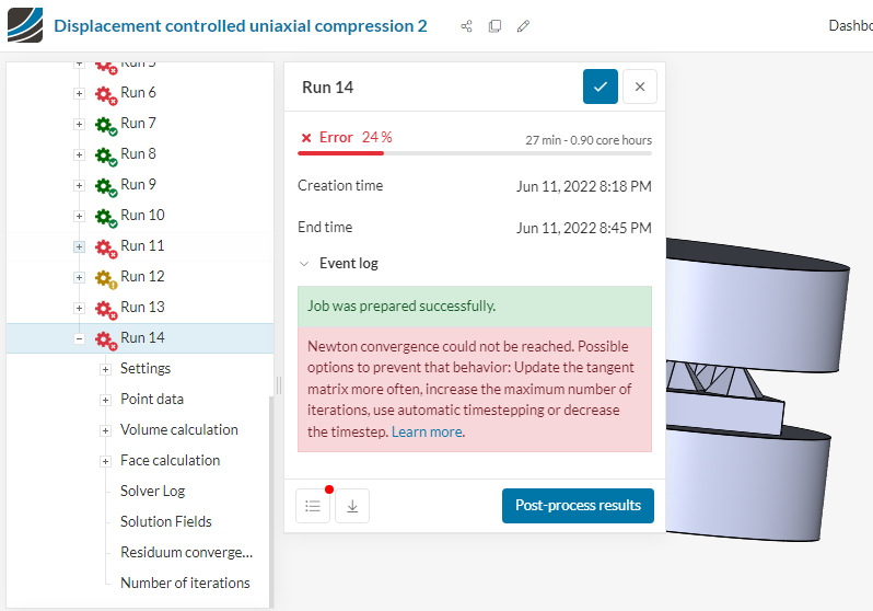 I have just copied the simulation and defined a custom material (polyvinyl alcohol sponge) as hyper elastic. But while running the simulation it shows the failure message. Do you have any suggestion for me on how to overcome this?
