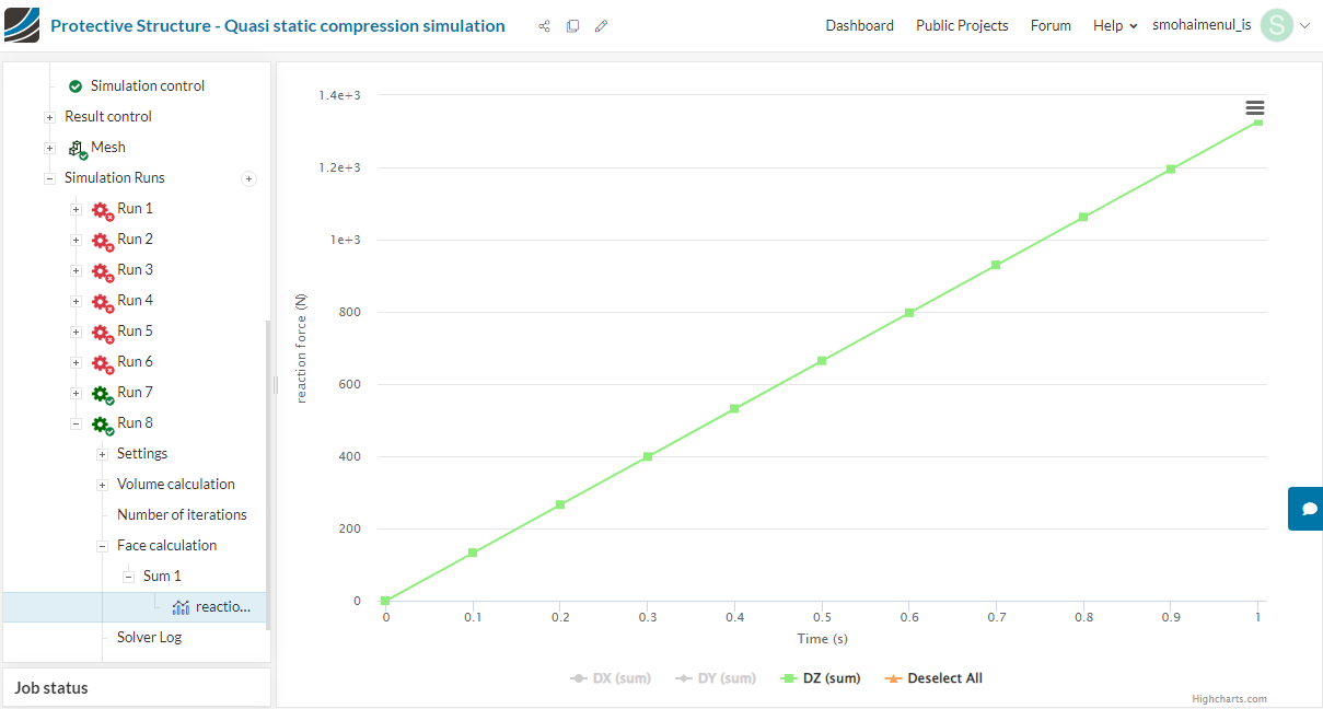 It is a compression test with strain rate 0.002 s^-1 and the nature of this project is static nonlinear. I want to have a force vs. displacement graph from the simulation. But every time I run, the simulation failed. It is probably due to improper simulation set up.