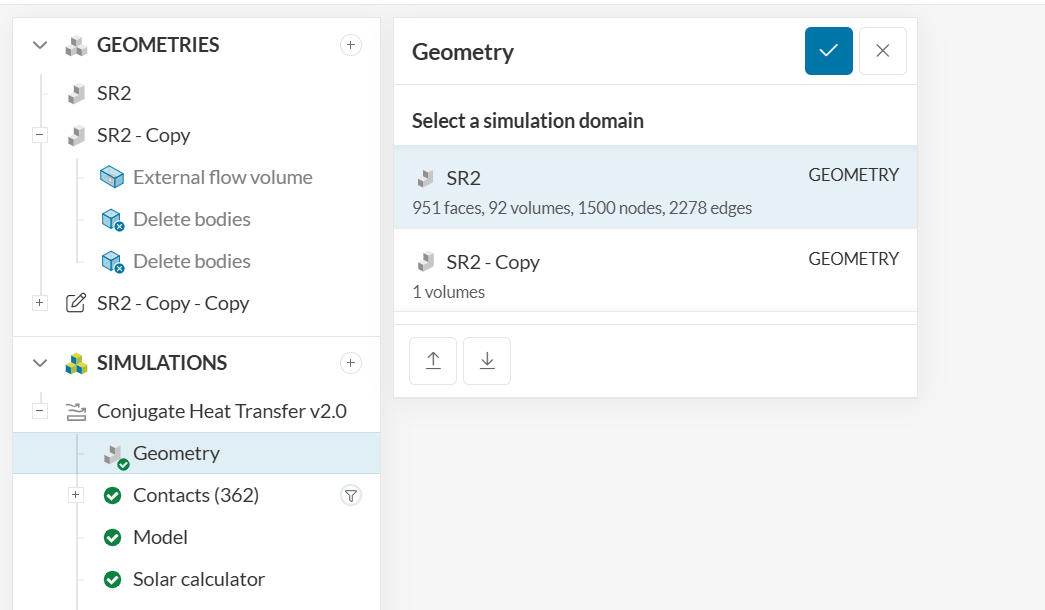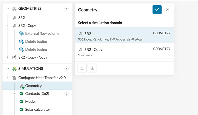 The simulation tree is currently associated with the geometry that does not have a flow region (“SR2”) instead of being associated with the geometry that has a flow region (“SR2 - Copy”).
