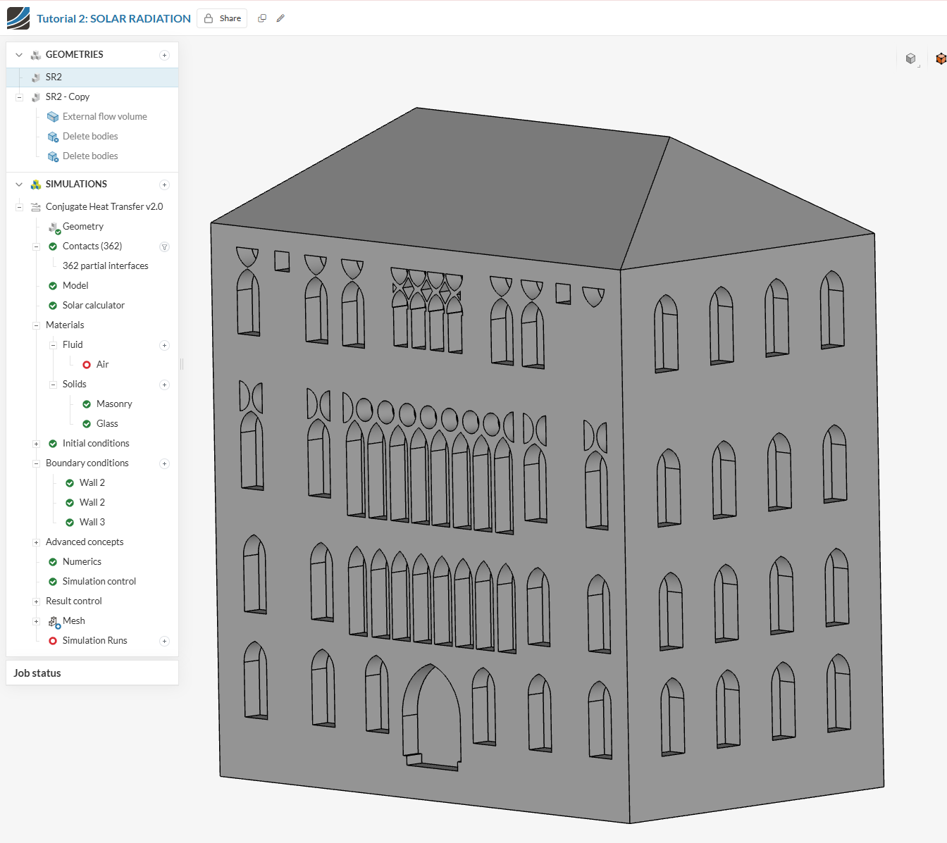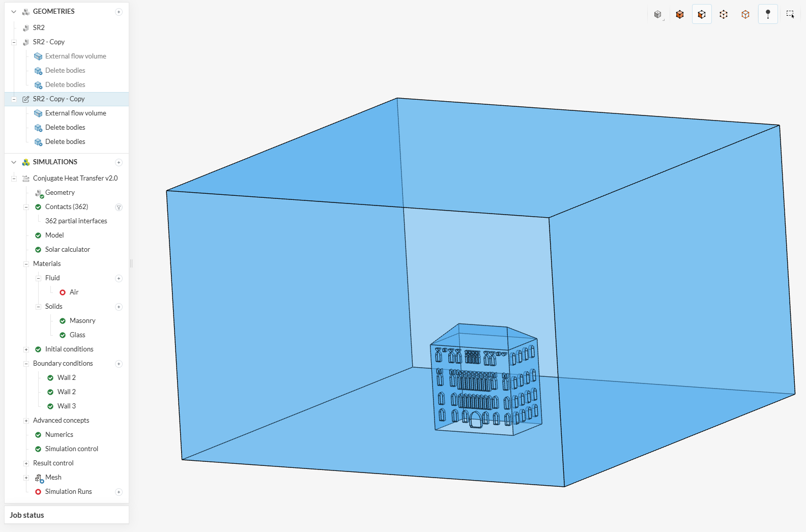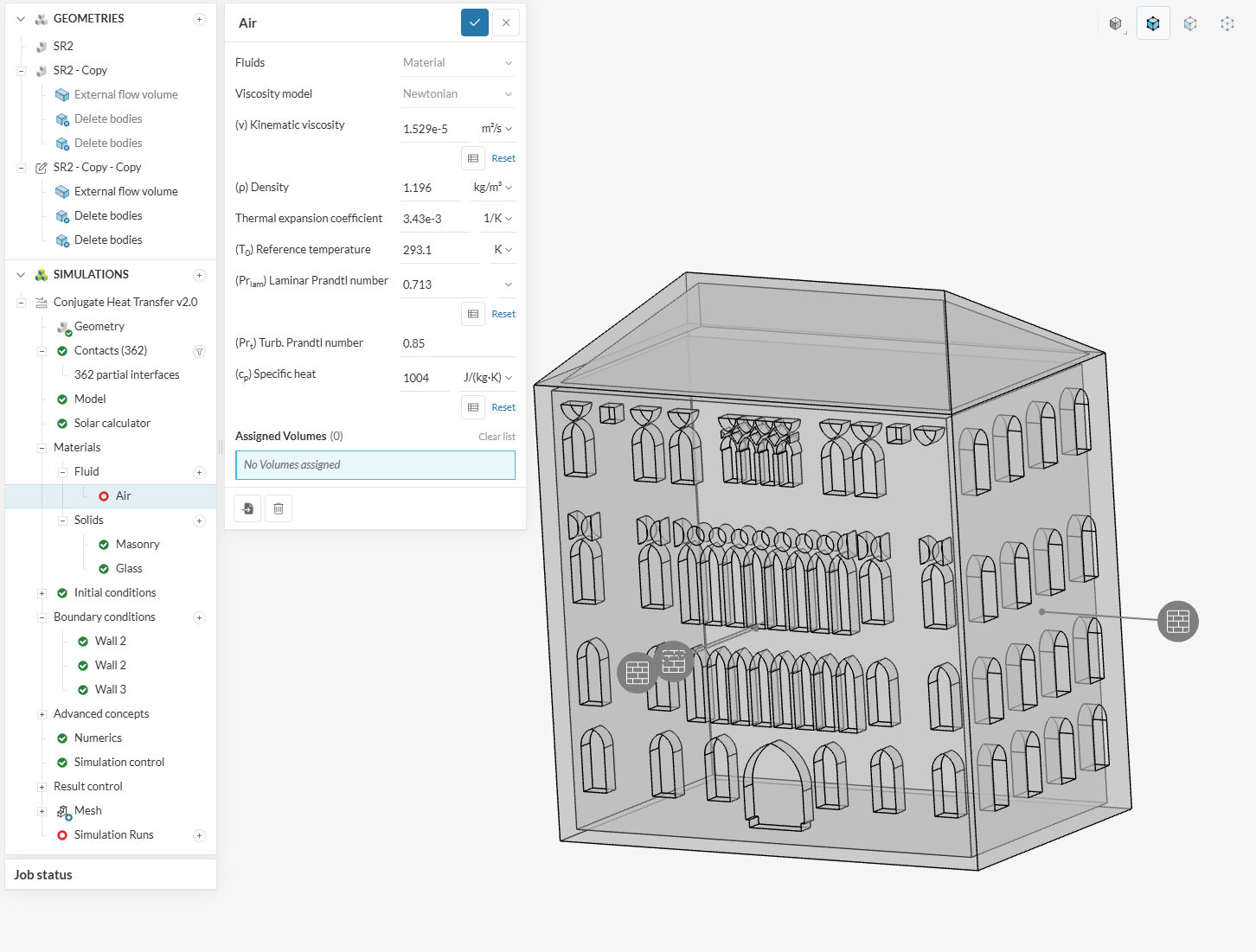 I switched the geometry to "SR2 - Copy " and I could assign the material to the external flow volume, but the materials and walls under the boundary condition are missing. The simulation was completed, but the results show the temperature in the hollow part of the building. I need to see the impacts of the solar radiation and temperature on the north and east walls (walls with openings). How can I have these results?