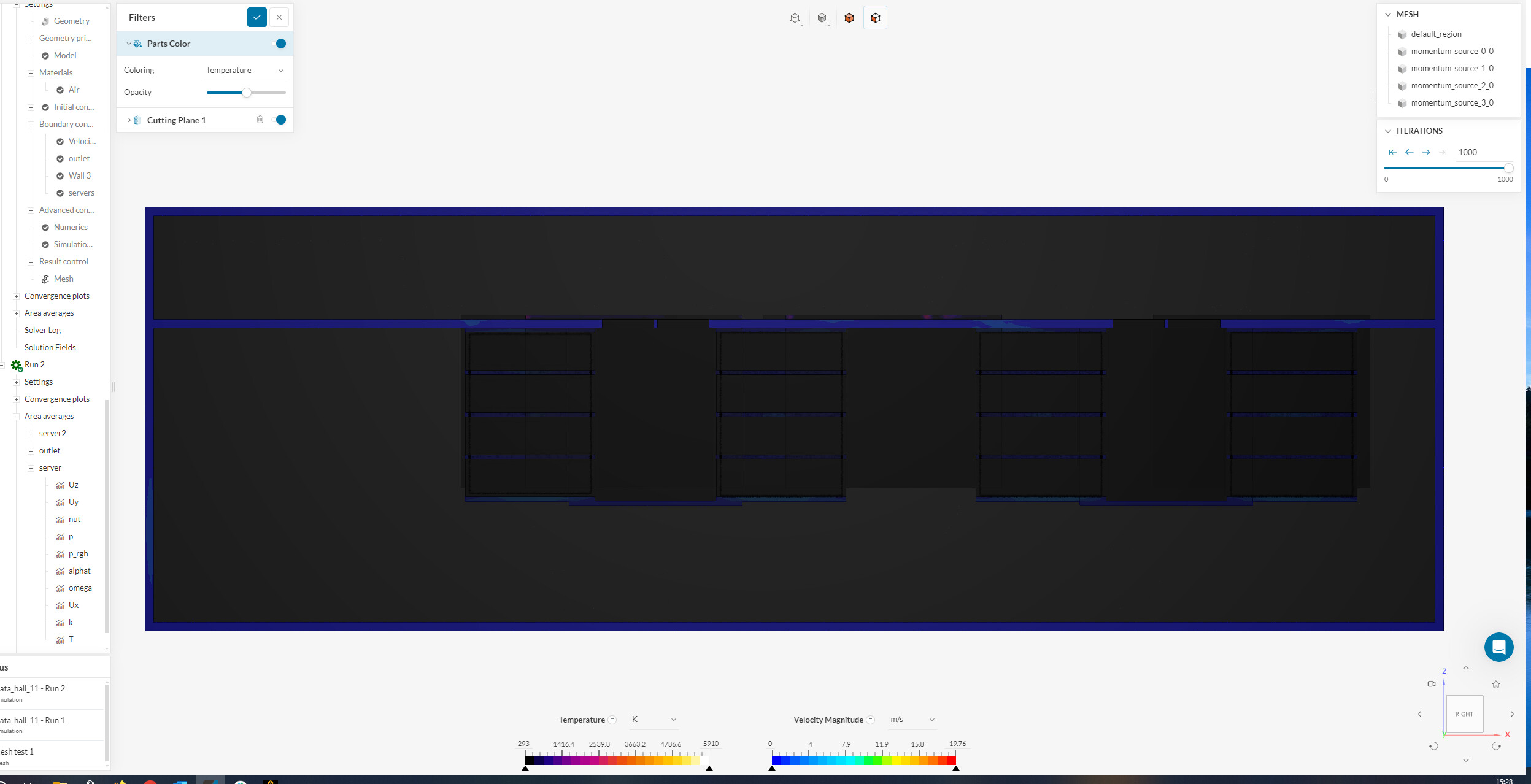 I tried that with velocity inlets of 5m/s and 1, I have max velocities reaching 10m/s inside the Racks walls, but still I have no big temperature variation, any idea what can cause this? or how it could be solved