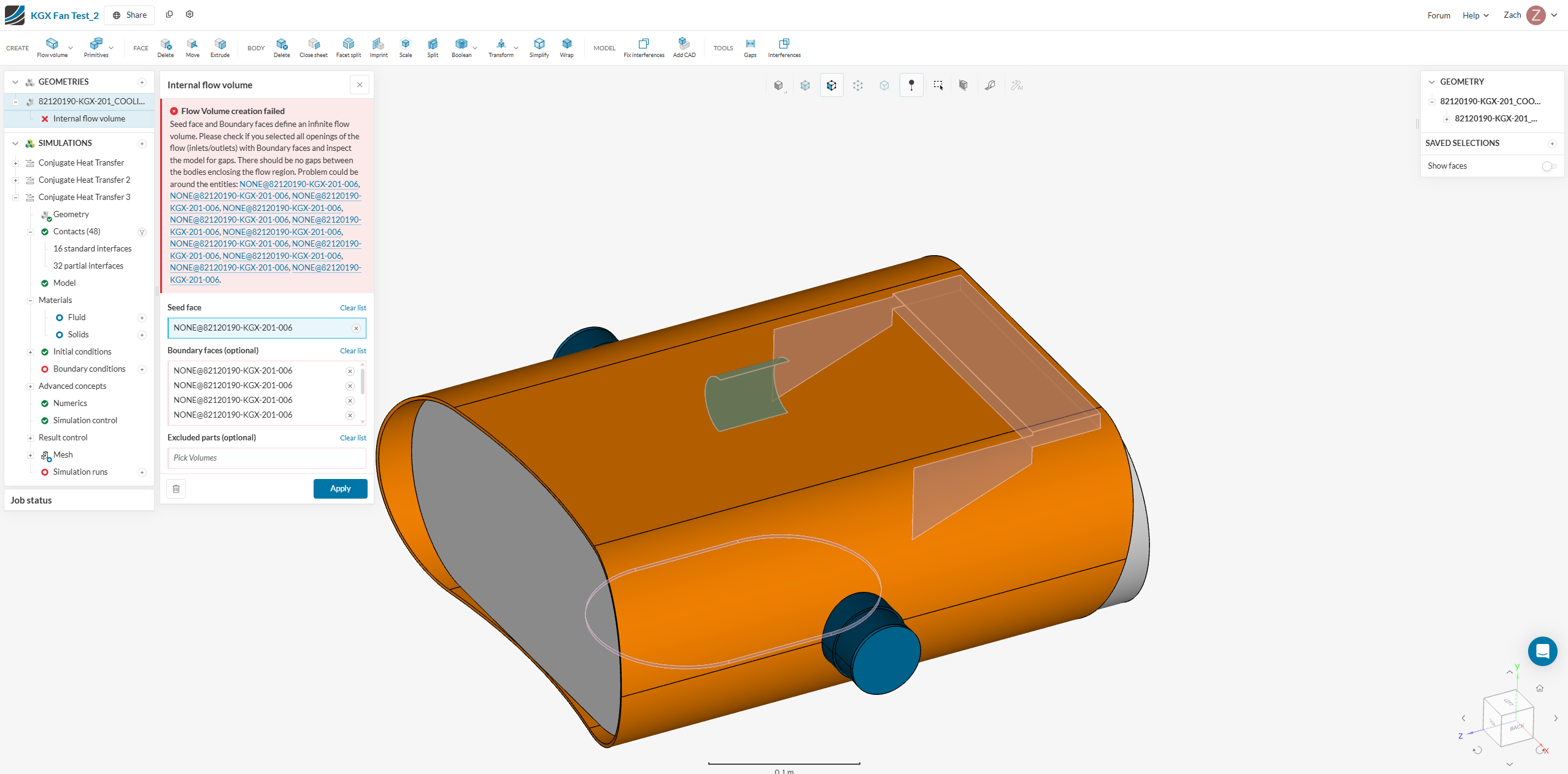 Struggle with the basics of trying to assign the internal flow volume from imported CAD. This is a basic assembly of a odd enclosure with a bottom Inlet and side Exhaust. Internally there are 2 fans in addition to some heat generating hardware (camera and monitor screen). The goal would be to determine effectiveness of the fans to cool the internal hardware in the end. There error I get is either there are gaps or an infinite flow region depending on the Seed face I select. Any guidance would be appreciated as I know I am way off. I did go through Tutorial 2 before attempting to set this up. Thanks all