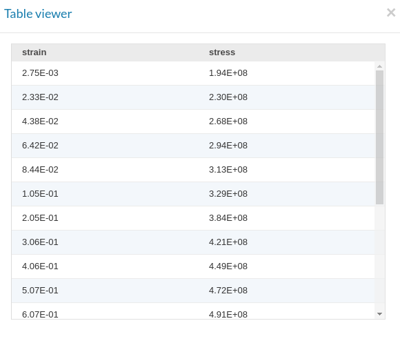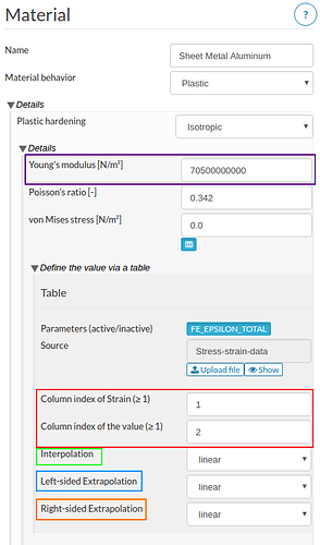 Defining elastoplastic material is fairly simple in SimScale thanks to table upload. You can define such type of material by just uploading a .csv file containing the strain values in first column and dependent stress values in second column distributed by a delimiter (compatible: comma, semicolon, tab, space). A step by step guide below shows how to do that considering a material whose Young’s modulus (E) is dependent on temperature:
