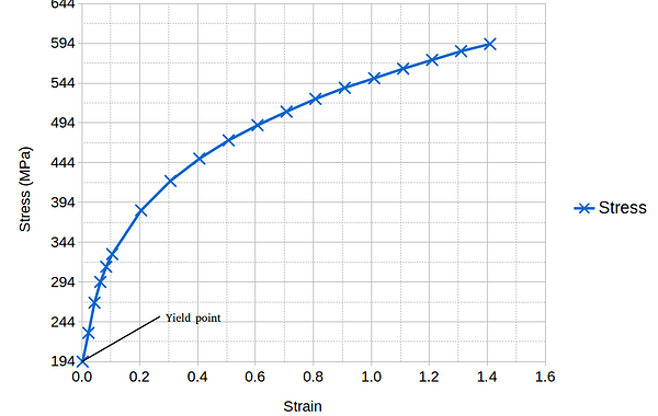 Using your material stress-strain data, make a a .csv file. The graph below shows an example of an elastoplastic Aluminum stress-strain data curve.