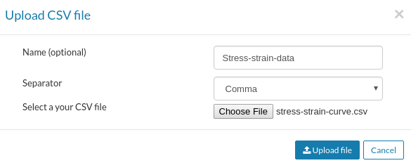 ). A Upload CSV file window will pop up as shown in the figure below. Click Choose file and select your material file. Give it a name (optional). Next click Upload file. -