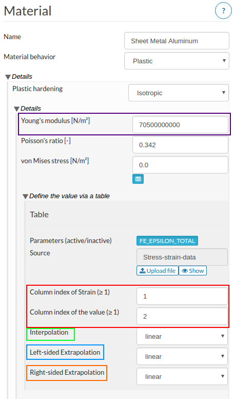 Highlighted in blue is the Left-sided Extrapolation criteria which is set to linear. In current case it would mean that any value of stress for strain values below 2.75e-3 linearly interpolated to the first value of 19.4 MPa.
