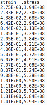Using this material data (since solver takes first value as a yield point value), one can create a comma delimited .csv file which will look like in any text editor as: