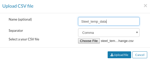 ). A Upload CSV file window will pop up as shown in the figure below. Click Choose file and select your material file. Give it a name (optional). Next click Upload file. -