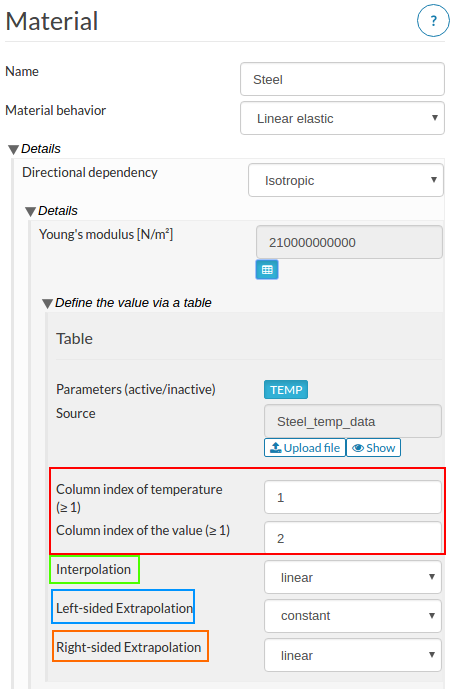 Highlighted in orange is the Right-sided Extrapolation criteria which is set to linear. In current case it would mean that any value of Young’s modulus for temperature values above 1213 K will be decreased linearly based on last two values.
