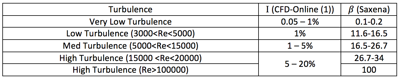 To start the calculation, the Turbulent Intensity I, and Viscosity Ratio \boldsymbol{\beta} need to be approximated by using the table below.