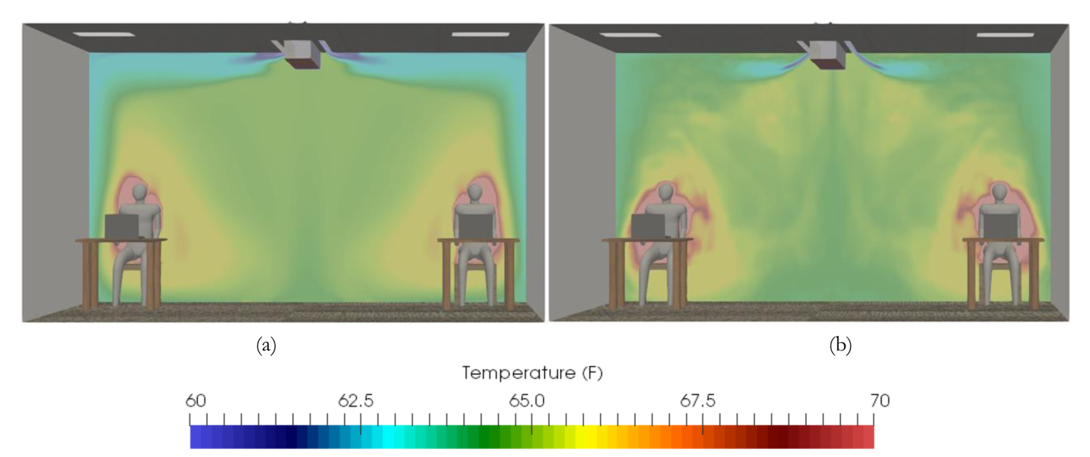 Finally, flow structures should be analyzed to assess the cooling performance in built environment using active chilled beams, based on metrics like thermal comfort and draft risk. The induction ratio (IR) was accurately predicted by LES while RANS predicted IR within 8% error, when compared to experimental data. LES model captured the detailed flow structures and jet width relatively better. Results also confirmed draftless cooling of the office space.