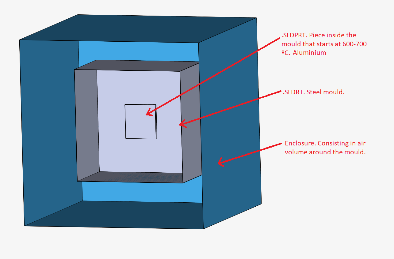 I am simulating a three cube one inside another to emulate the heat transfer between an aluminium cast piece at 600-700ºc approx (nucleus, smallest cube) and the mould structure (second cube) and the air (the biggest one that are an enclosure). I’ve built a model in SolidWorks combining the two cubes in an assembly, moving the smallest cube inside the big one (I haven’t created a cavity because it doesn’t leave me to differentiate the two cubes for selecting different materials) . After that, I uploaded a .zip file where both .sldprt and the assembly (.sldasm) files were uploaded. I have also created an enclosure for simulating the heat transfer in the behaviour.