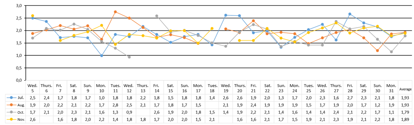 The experimental data was obtained through the furnace monitoring in the steelworks with the aid of measuring equipment (dimensions regarding the furnace and time), the flow being calculated through the equation of continuity given above. The months of July (blue) and August (orange) refer to the glove of 120mm, the month of September was discarded because it is a transition month and the months of October (gray) and November (yellow) refer to the glove of 130mm.