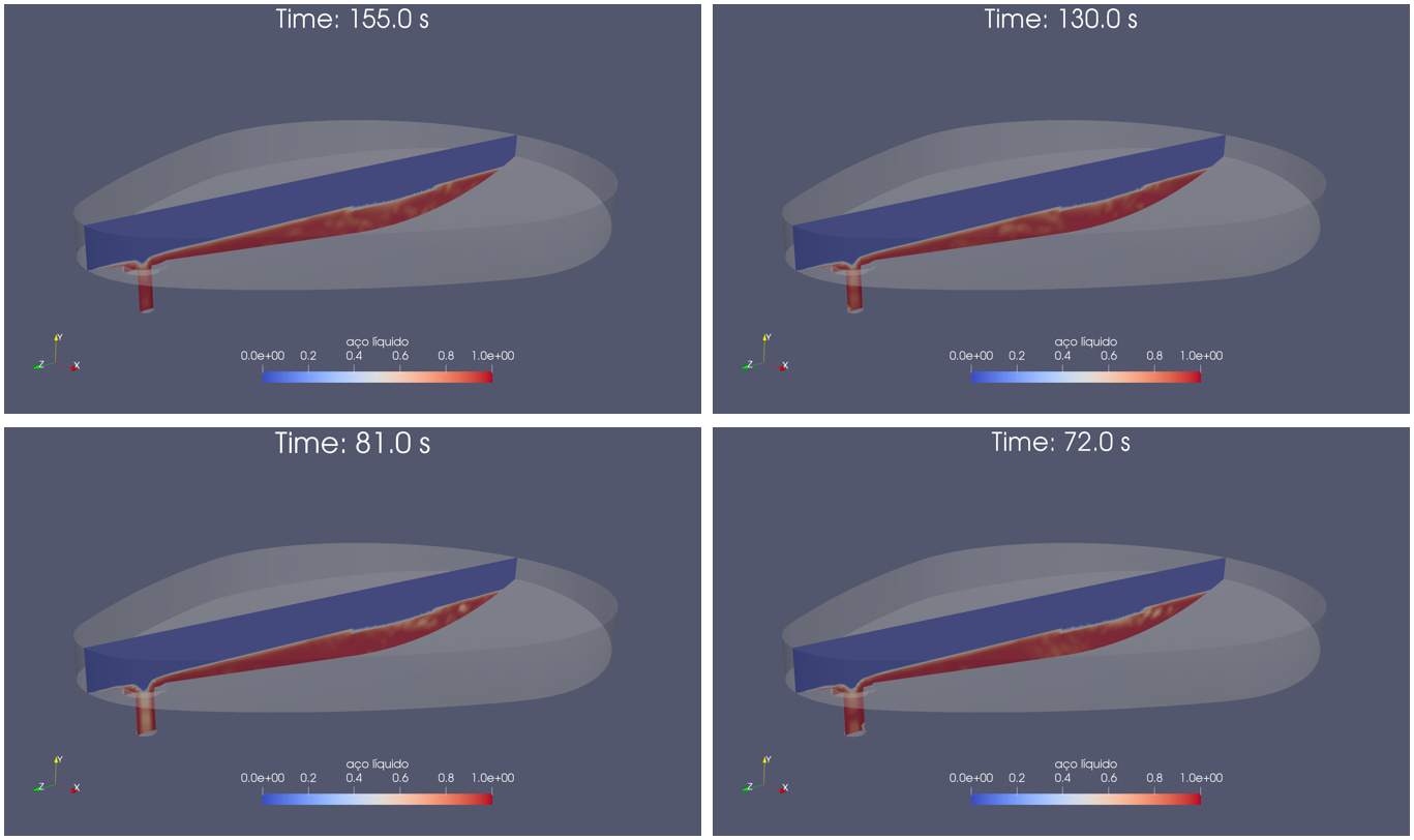 The validation of the CFD model via SimScale was compared with the results measured in the steelworks (Figures 6 and 7). It is verified that there is a small variation in the time of arrival in the liquid foot collected in the area in relation to the CFD. This difference is due to geometric approximations made to facilitate the discretization of the model, however, the value fluctuates in about 5 seconds translates a good convergence in the results.