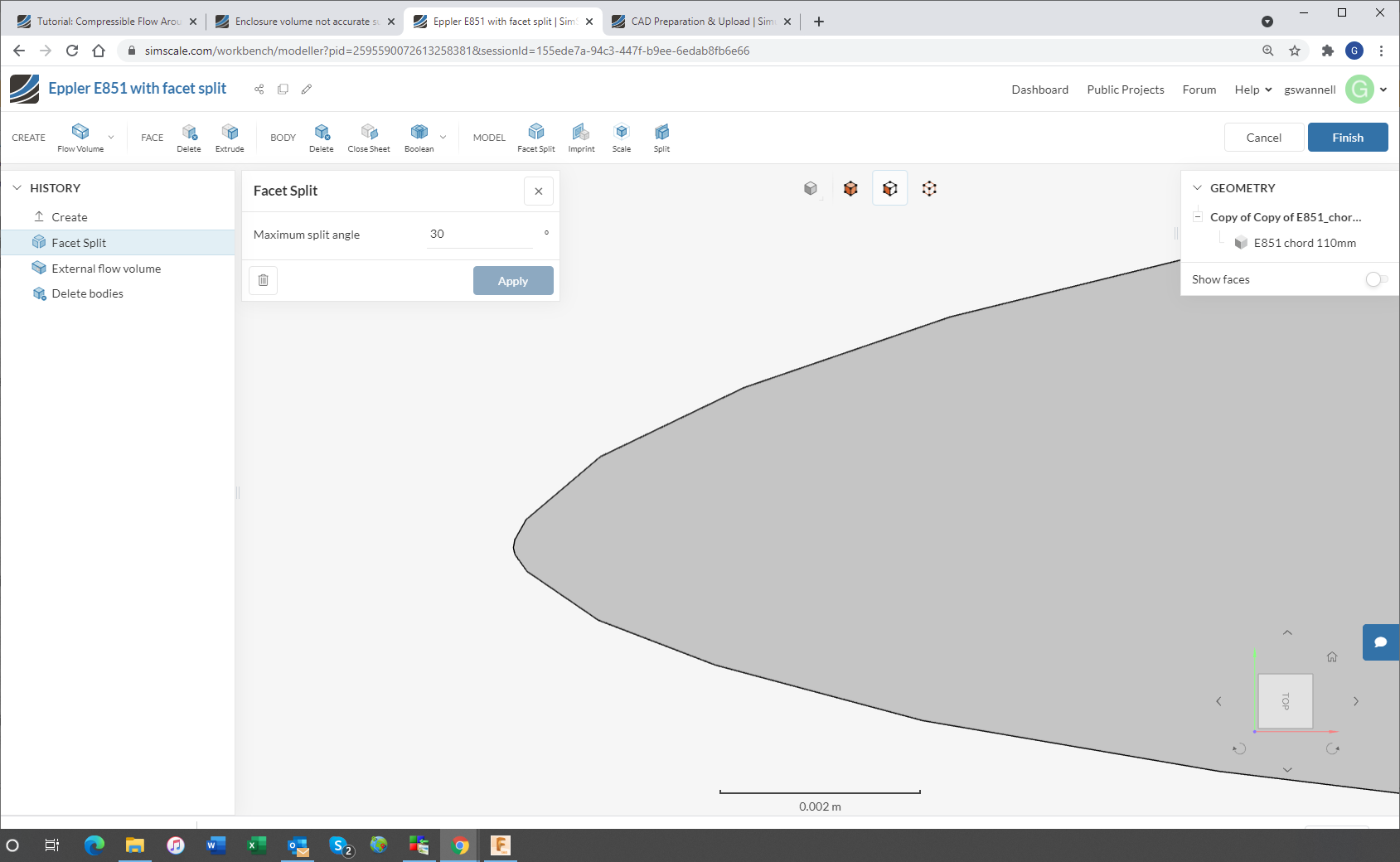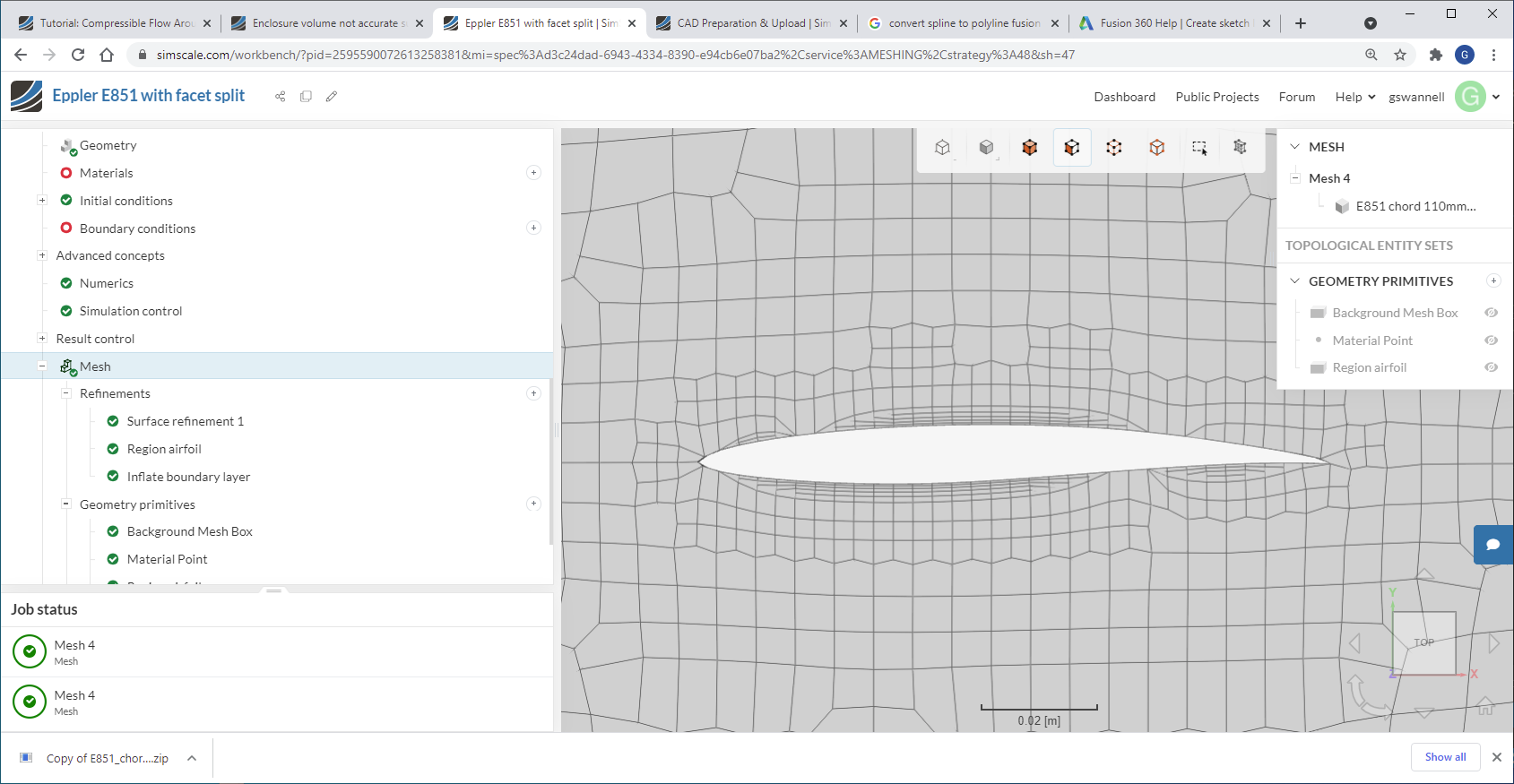 I have found a work around. The problem seems to be the spline representation of the airfoil shape. So I regenerated the airfoil from 64 points to 200 points and imported into Fusion 360 as straight lines between the points. The shape is sufficiently smooth and reads into SimScale OK. See preliminary mesh -more refinement needed yet. One problem is each straight line generates a surface so I end up with lots and lots of surfaces but I can group them to define the airfoil surface. If you do find another way forward I would be interested but I think I can proceed now. Thanks for your help.