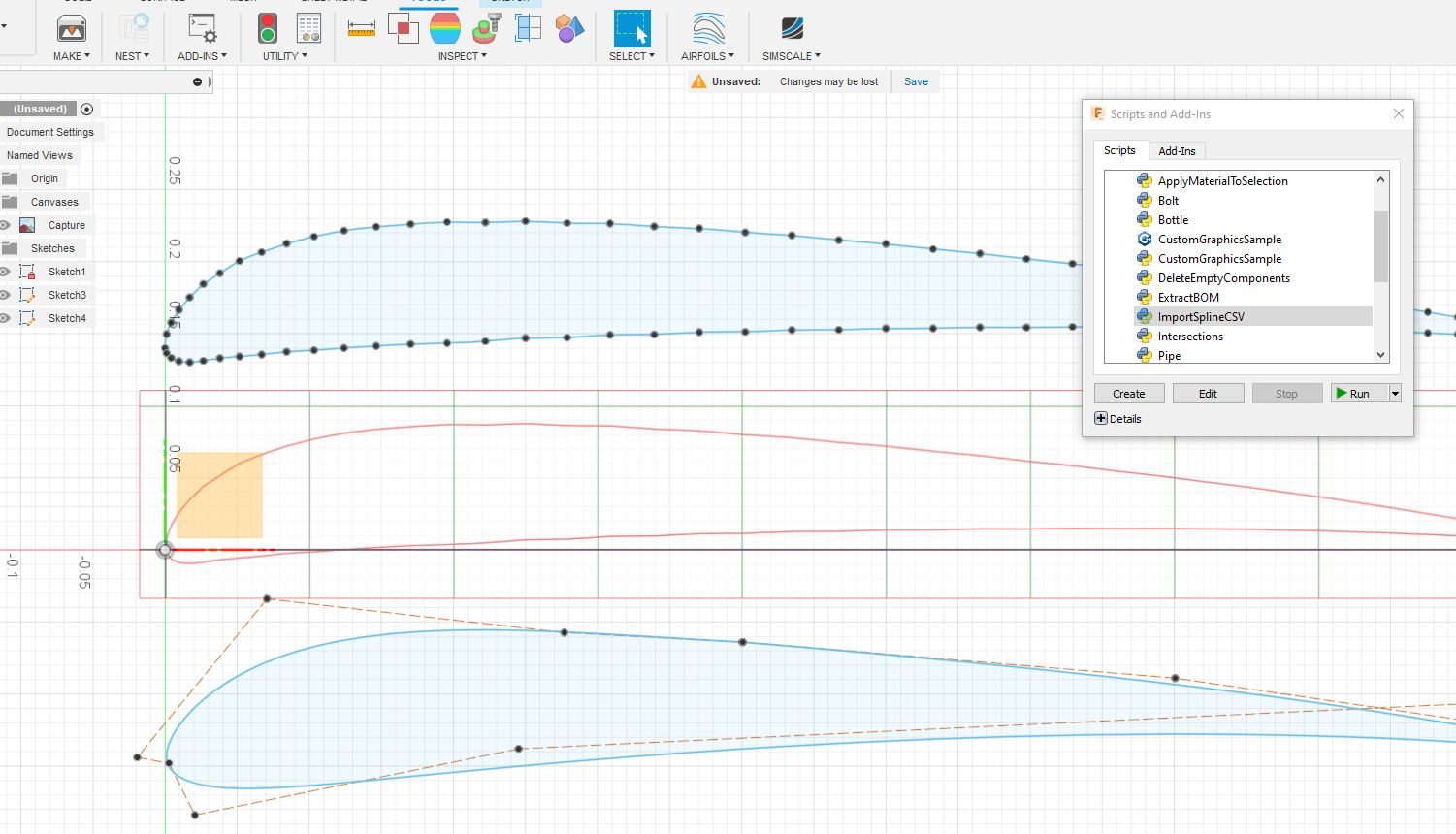 I tried a small experiment to see if I could improve the refinement of spline imports into Simscale, but no luck. I importing a 10 times larger Fusion Spline model into Simscale and did a 10 times scale reduction in Simscale but no resolution improvement was noted. Segment length remained the same, which were pretty small at the airfoil nose at 0.5mm long, which is pretty small.